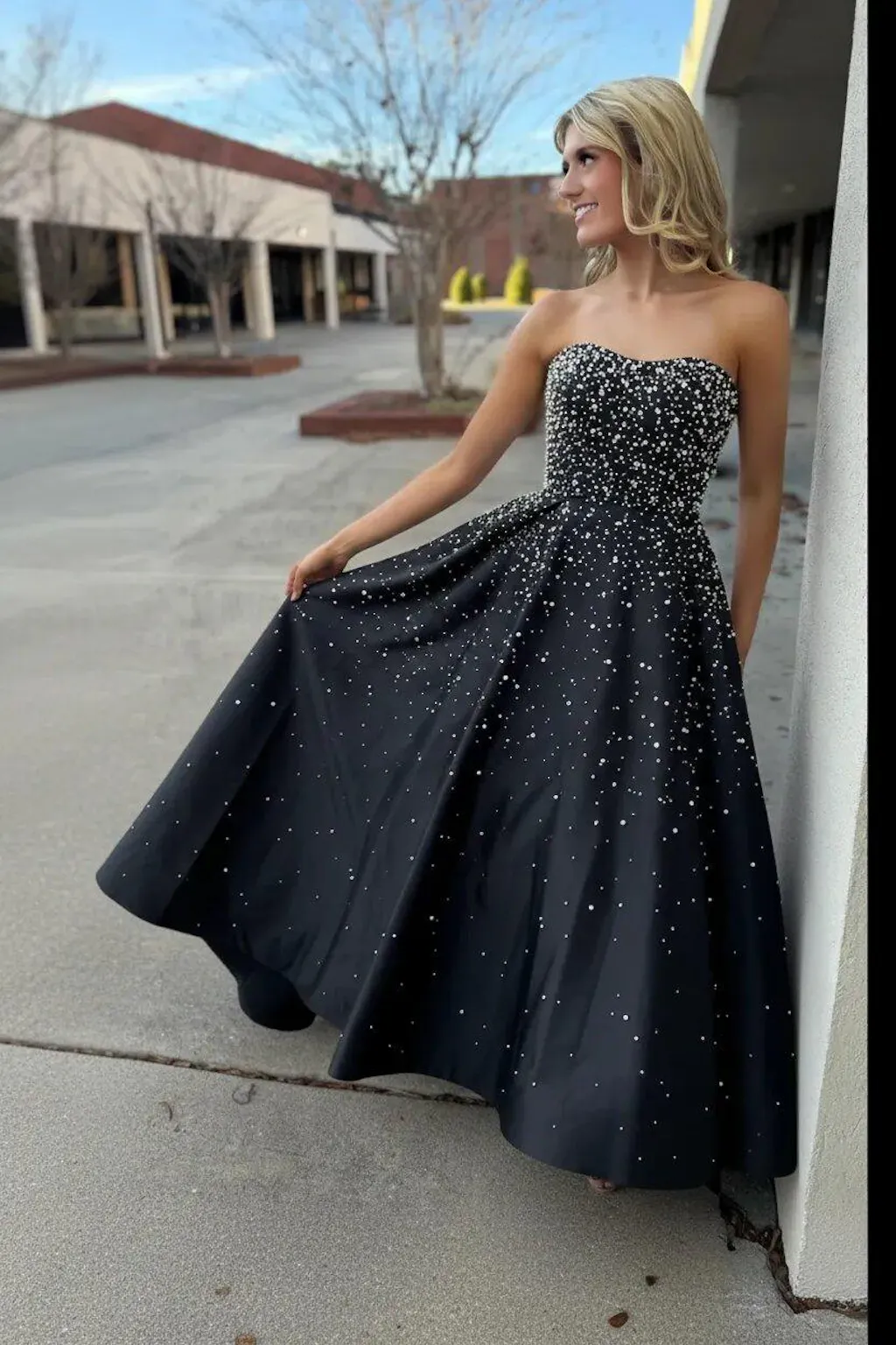 I was kinda nervous ordering a prom dress online but this one turned out really nice. The top has pretty bead details and the satin skirt flows really well. It definitely doesn’t look cheap.