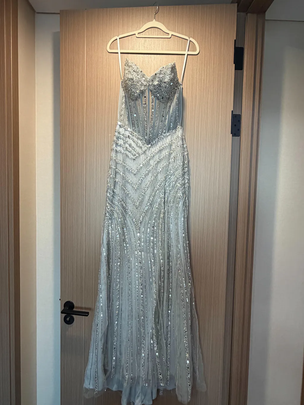The light blue color is even prettier in real life. The pearls and beads sparkle a lot under lights and it looks amazing in photos.