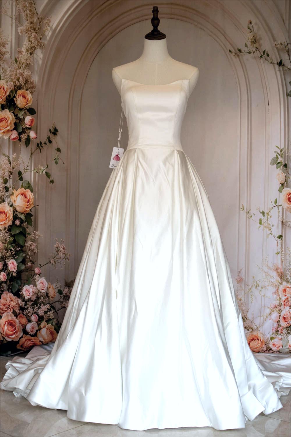 This wedding dress perfectly shows the noble temperament of the bride with its classic and elegant cut. The wedding dress is made of delicate white satin material, which is soft to the touch and has a high gloss, adding a touch of gorgeous brilliance to the overall shape. The A-shaped skirt design can not only cleverly modify the body shape, but also give the bride a light and elegant visual effect. The strapless design shows the bride's shoulder and neck lines, adding a touch of sexiness and softness. The tail design is suitable for formal occasions such as churches, making the bride as elegant and charming as a fairy tale princess when she enters the hall.