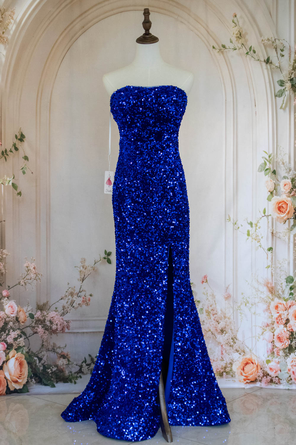 With a noble royal blue hue, it exudes an elegant and mysterious temperament, allowing you to stand out from the crowd. The strapless design cleverly shows the soft lines of women while maintaining the right degree of dignity and sexiness. The sequin decoration of the dress is like the brightest star in the night sky, shining charmingly with your every move, ensuring that you will be the most dazzling focus of the ball. The long design gracefully falls to the ground, not only elongating the proportions of the body, but also adding a touch of solemnity and gorgeousness.