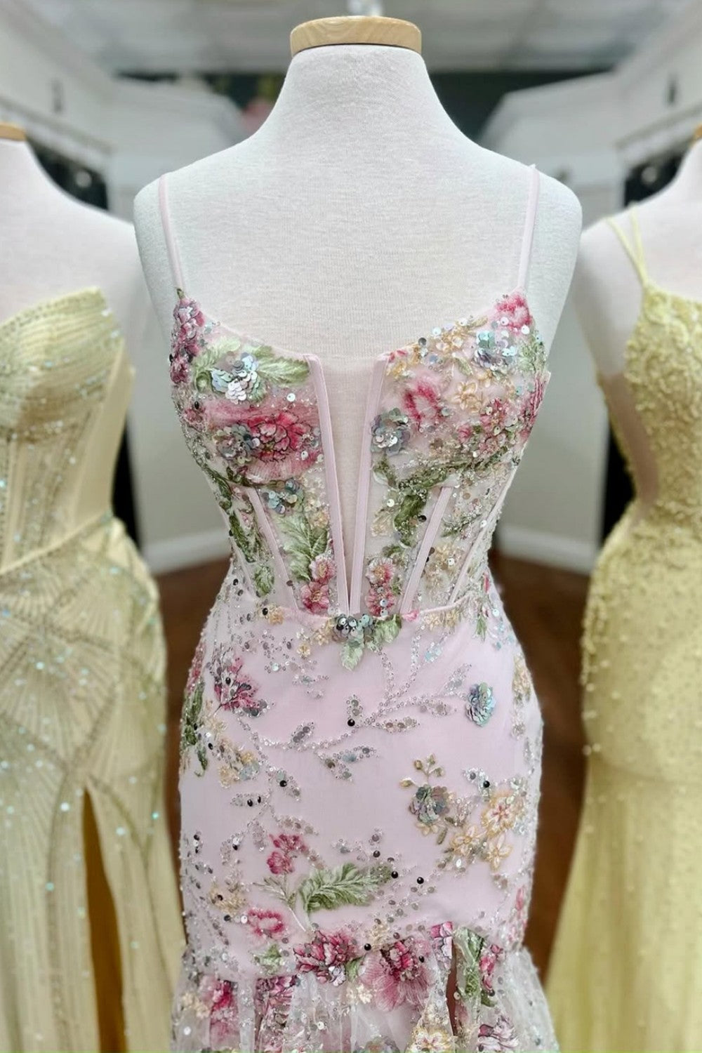 Step into elegant romance with this stunning blush mermaid prom dress. Featuring a sheer corset bodice, it beautifully shapes your figure while adding a touch of modern allure. Delicate floral appliqués enhance the gown with soft, feminine detail, while the fitted mermaid silhouette accentuates your curves. Finished with a daring high slit for graceful movement, this dress is perfect for prom, formal events, or any special occasion where sophistication meets glamour.