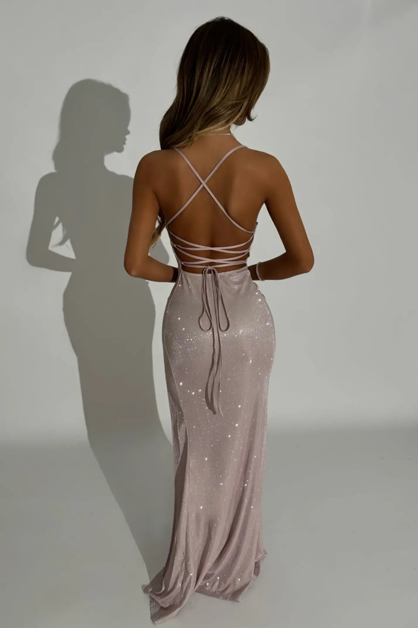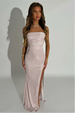 This Blush Pink Strapless Lace-Up Sparkle Prom Dress with Thigh-High Slit features a chic strapless neckline and a lace-up back that creates a flattering, secure fit. Subtle sparkle details add radiant glamour, while the daring thigh-high slit brings movement and allure, making it a stunning choice for prom and formal evening events.