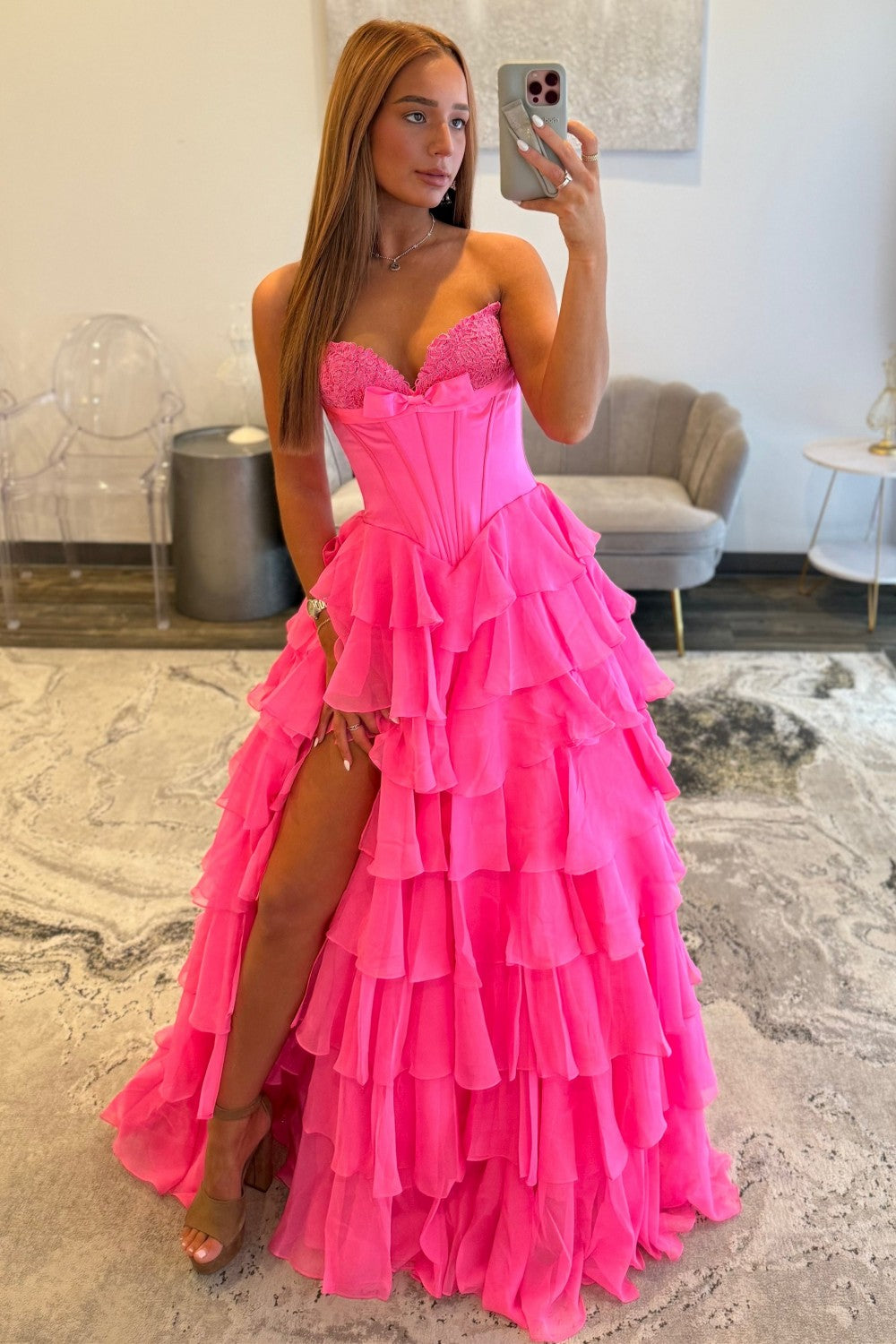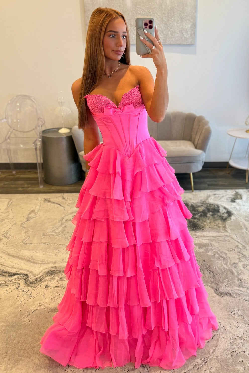 Make a bold yet elegant statement in this chic hot pink prom gown. Designed with a sweetheart neckline and a structured corset bodice, it beautifully defines your silhouette while offering a flattering, supportive fit. The flowing A-line skirt is finished with tiered ruffles that add soft volume and playful movement, creating a stunning contrast to the vibrant hot pink hue. Perfect for prom, formal events, or any special occasion where you want to stand out with confidence and style.