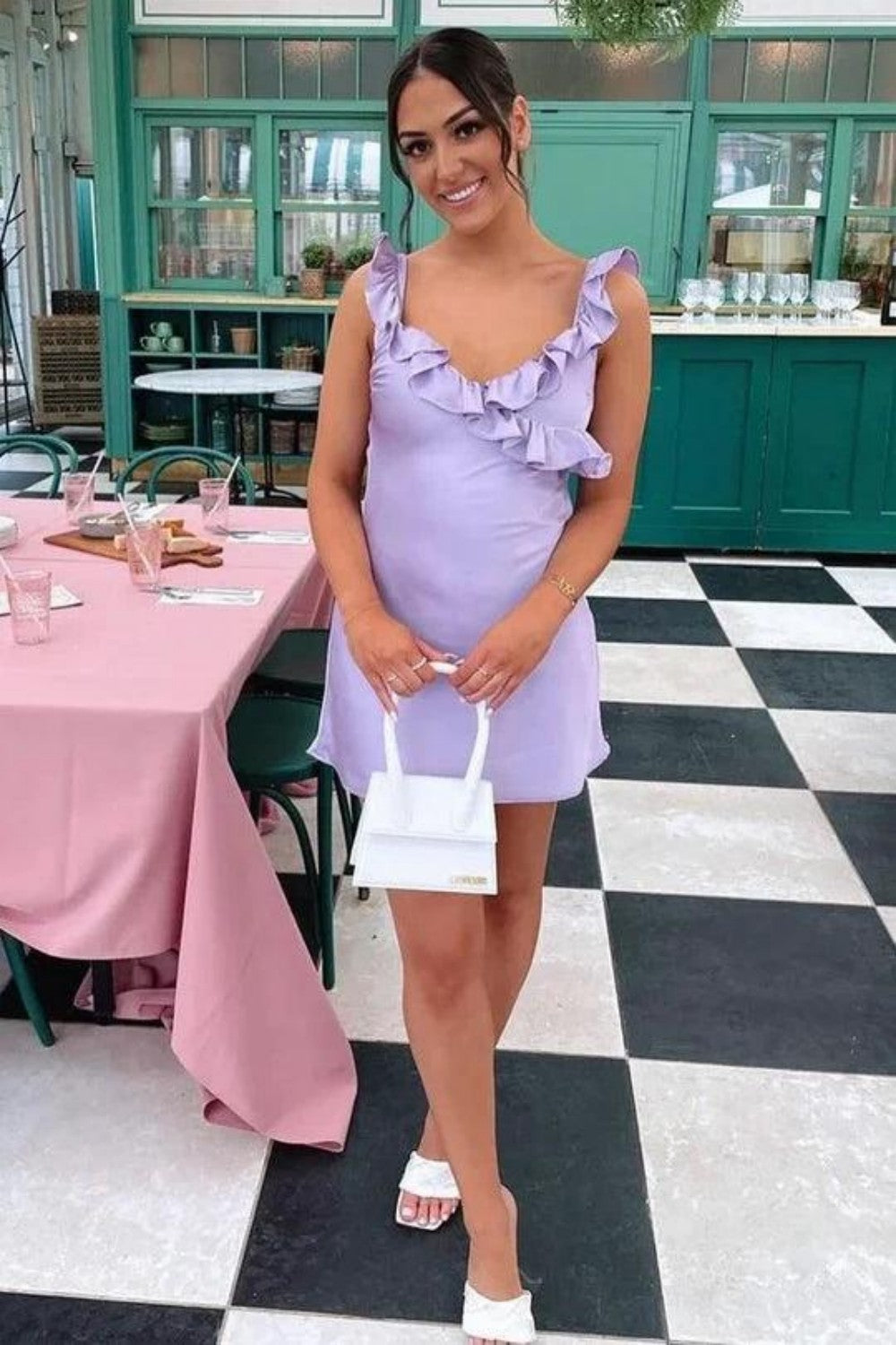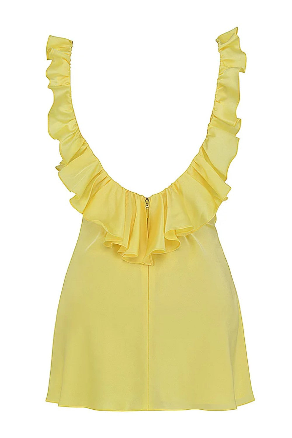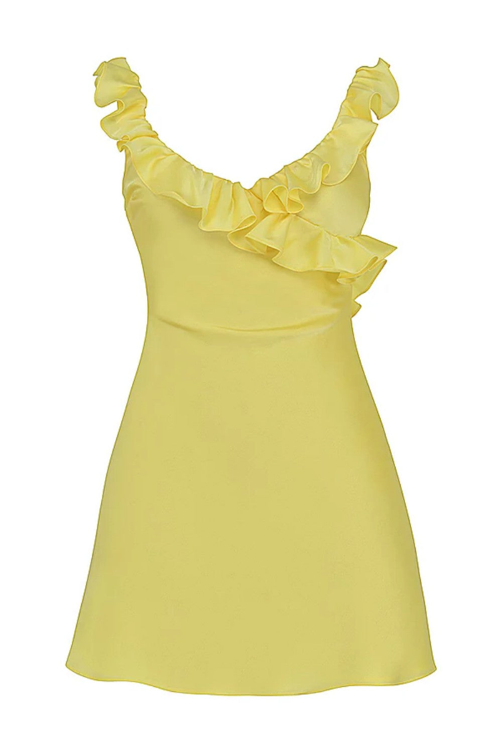 Turn heads at your homecoming in this chic sheath dress. The flattering V-neckline and vibrant yellow hue create a bold yet elegant look, while the ruffled details add a playful, feminine touch. This short dress is designed to hug your curves and provide a sleek, modern fit, making it the perfect choice for a night of dancing and celebration.