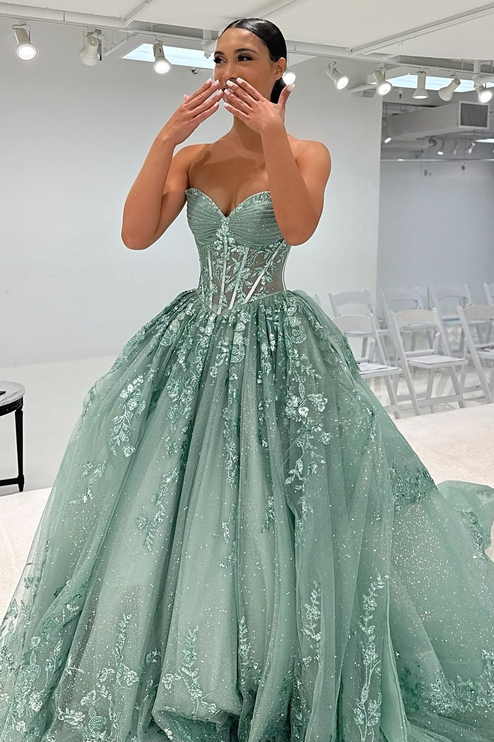 Embrace timeless elegance in this Classic A-Line Sweetheart Mint Green Long Prom Dress with Appliques. Featuring a romantic sweetheart neckline, this beautiful gown gracefully highlights the shoulders and décolletage for a soft, feminine look. The fitted bodice flows into a classic A-line silhouette, creating a flattering and comfortable fit for any body type.