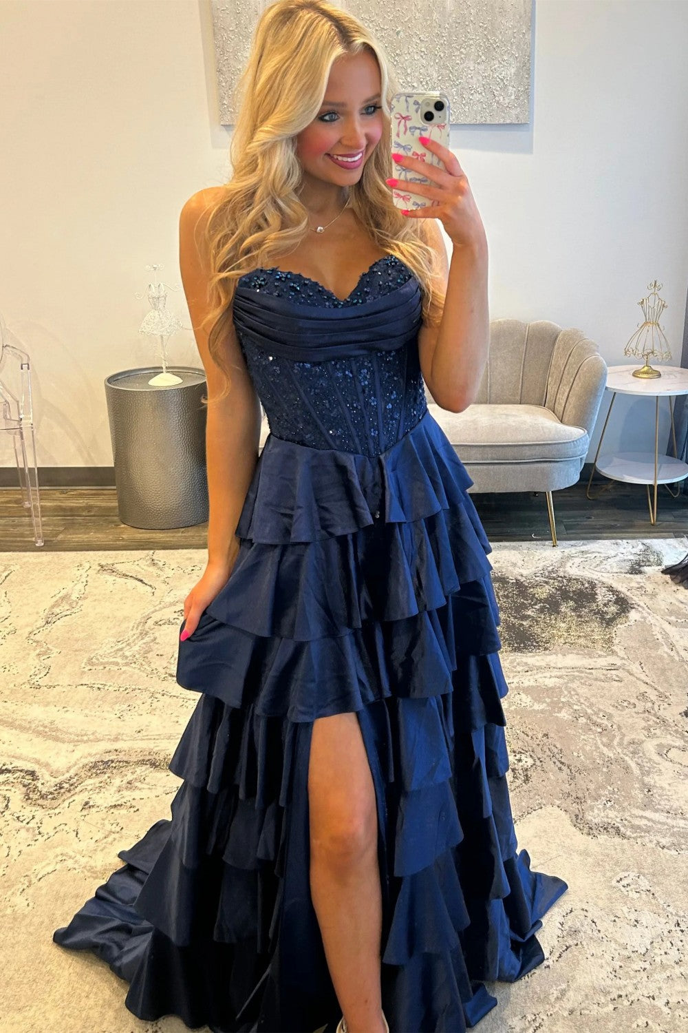 Embrace timeless elegance in this classic navy blue A-line prom dress. Designed with a sweetheart neckline and a structured corset bodice, it beautifully shapes your silhouette while offering a flattering, supportive fit. The tiered skirt adds graceful volume and movement, creating a romantic and refined finish. Perfect for prom, formal events, or any special occasion, this gown delivers sophistication with effortless charm.