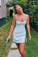 Steal the spotlight in this Cute Sheath Spaghetti Straps Light Blue Satin Short Homecoming Dress with Slit. Designed in smooth satin, this sleek sheath silhouette flatters your figure while the delicate spaghetti straps add a touch of dainty charm. The side slit gives it a flirty edge, making this light blue beauty perfect for homecoming, parties, or any special night out.