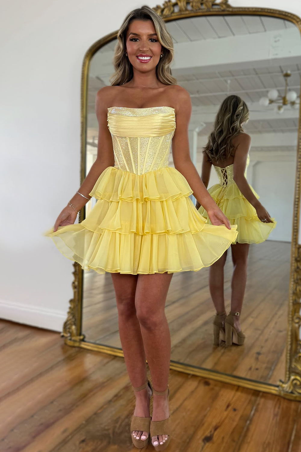 Brighten up any event in this Cute Yellow A-Line Homecoming Dress featuring a sparkling beaded strapless top and a flowy tiered chiffon skirt. The vibrant yellow hue adds a cheerful touch, while the A-line silhouette flatters every figure. Perfect for homecoming, summer parties, or any special occasion where you want to feel fresh, fun, and full of charm.