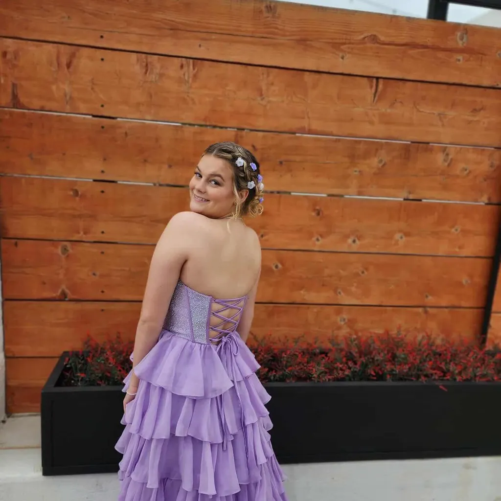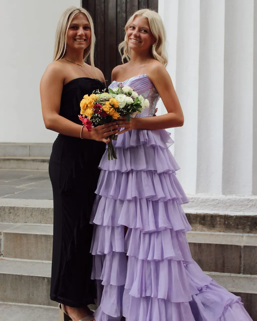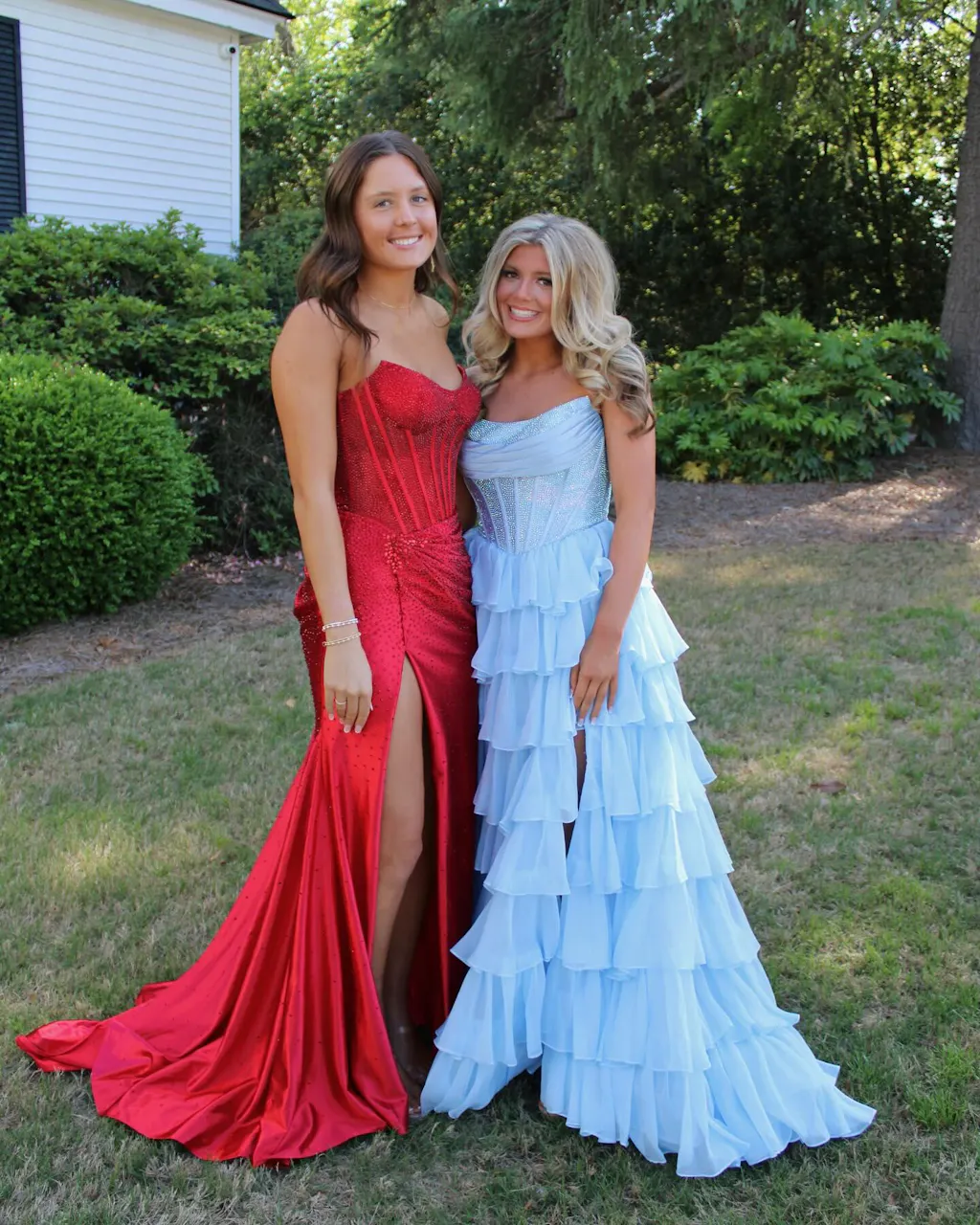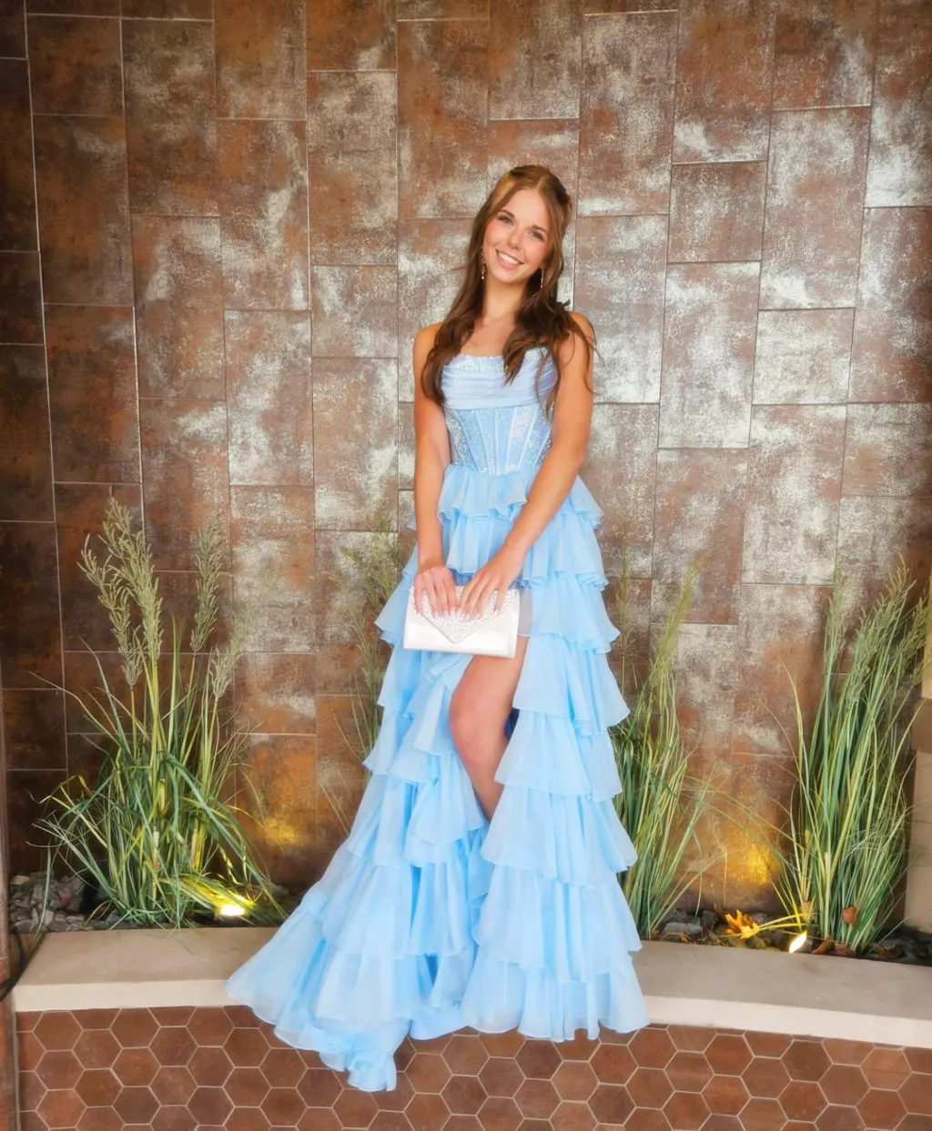 Shimmer with grace in this Strapless A-Line Prom Dress. Featuring a sparkling bodice and soft layered chiffon skirt, this gown combines timeless elegance with a modern twist. The strapless neckline highlights your shoulders, while the thigh-high slit adds a touch of allure-perfect for prom or any evening where you want to shine with sophistication.