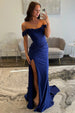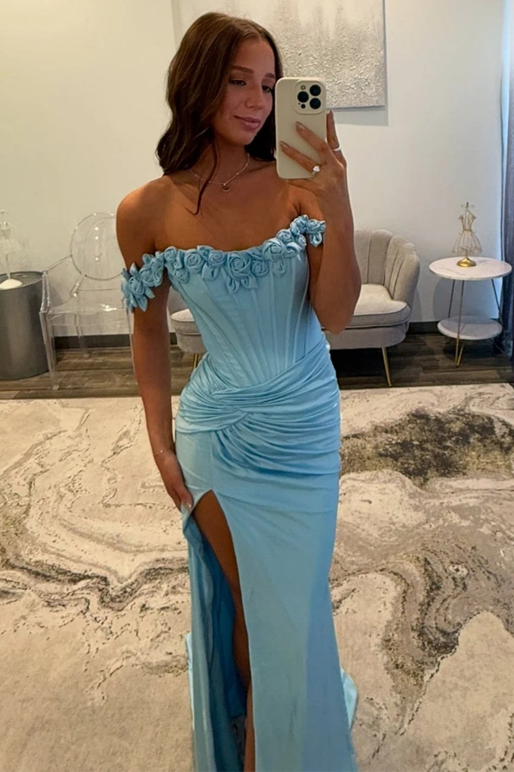 Step into romance with this elegant light blue prom dress. The off-shoulder neckline gracefully frames your shoulders, while the ruched satin bodice flatters your silhouette. Adorned with delicate 3D rose appliqués, this gown exudes feminine charm and sophistication. A daring side slit adds modern allure and effortless movement, making it perfect for prom, formal events, or any special occasion where you want to make a stunning impression.