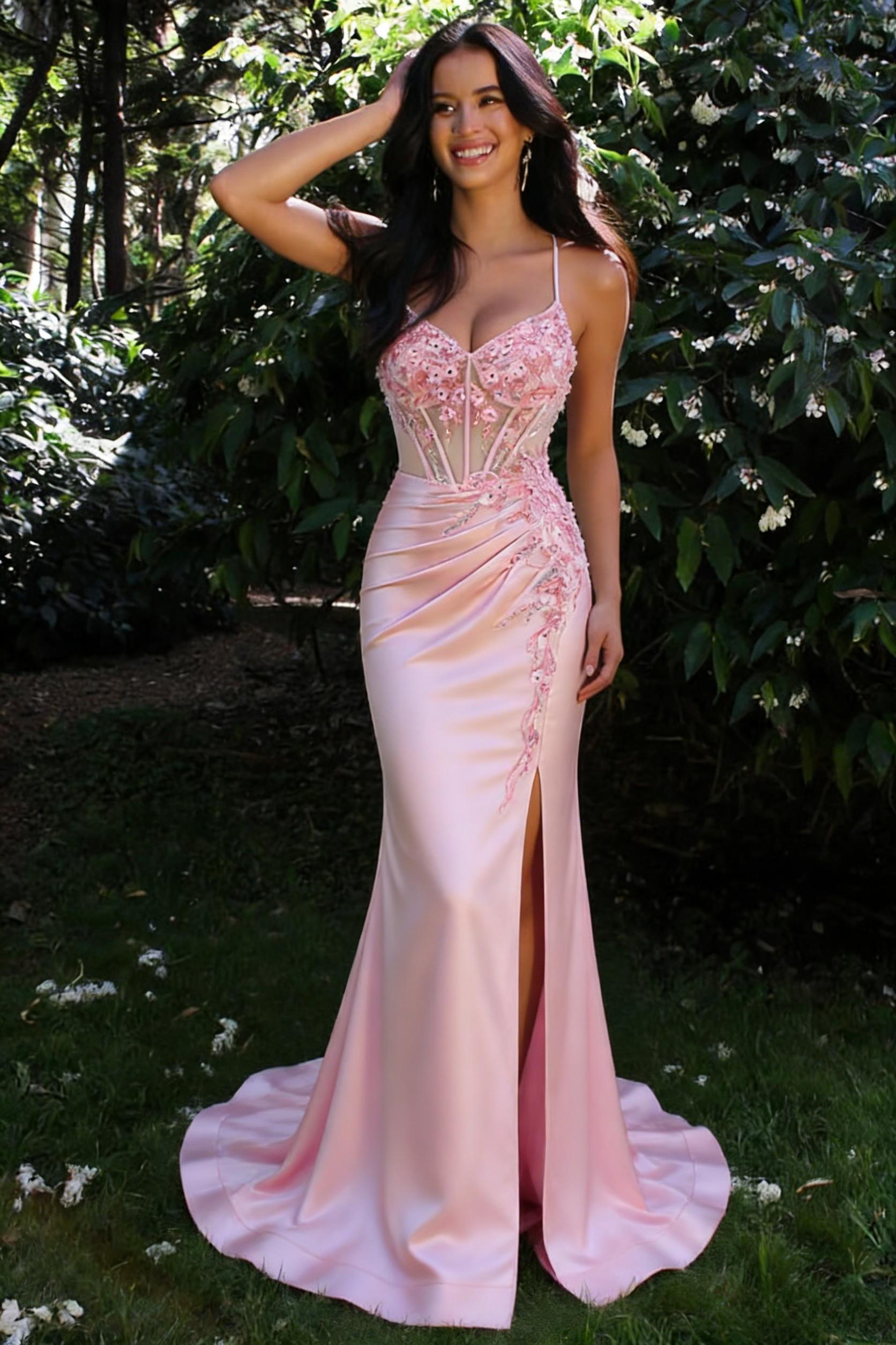 This Elegant Pink Satin Prom Dress with Floral Embellishments and Side Slit features a sleek satin silhouette that drapes gracefully over the body. Delicate floral embellishments add a romantic and feminine touch, while the side slit brings modern allure and movement. Finished in a soft pink hue, this gown is perfect for prom, formal events, and special occasions where elegance meets understated glamour.