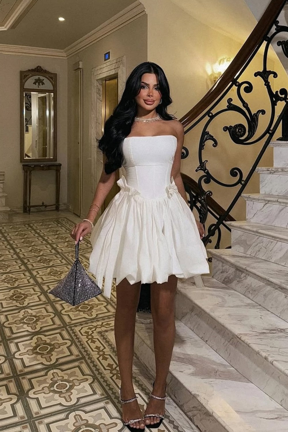 This white strapless corset mini dress features a structured bodice that cinches the waist, paired with a voluminous puff skirt for a romantic ballerina like charm. The corset design flatters curves, while the mini length adds modern flair. Perfect for proms, wedding receptions or glamorous dinner parties, it blends elegance and playfulness seamlessly.