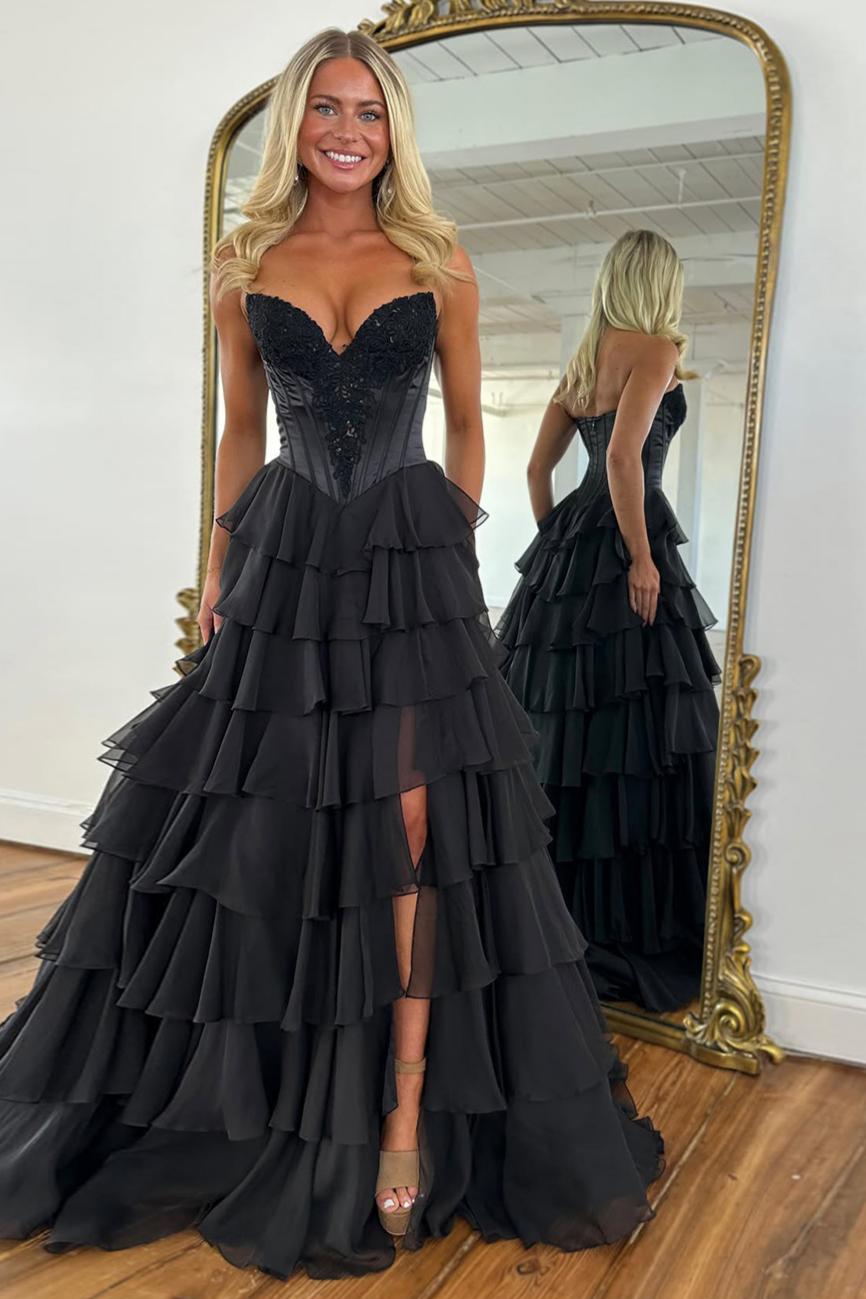 Turn heads in this stunning emerald green prom dress designed to combine elegance with a touch of drama. The sweetheart neckline and corset-style bodice beautifully accentuate your curves, offering a flattering, structured fit. The tiered ruffles on the skirt add movement and romantic flair, while a daring high slit ensures graceful steps and a hint of allure. Perfect for prom, formal events, or any special occasion where you want to shine with confidence.