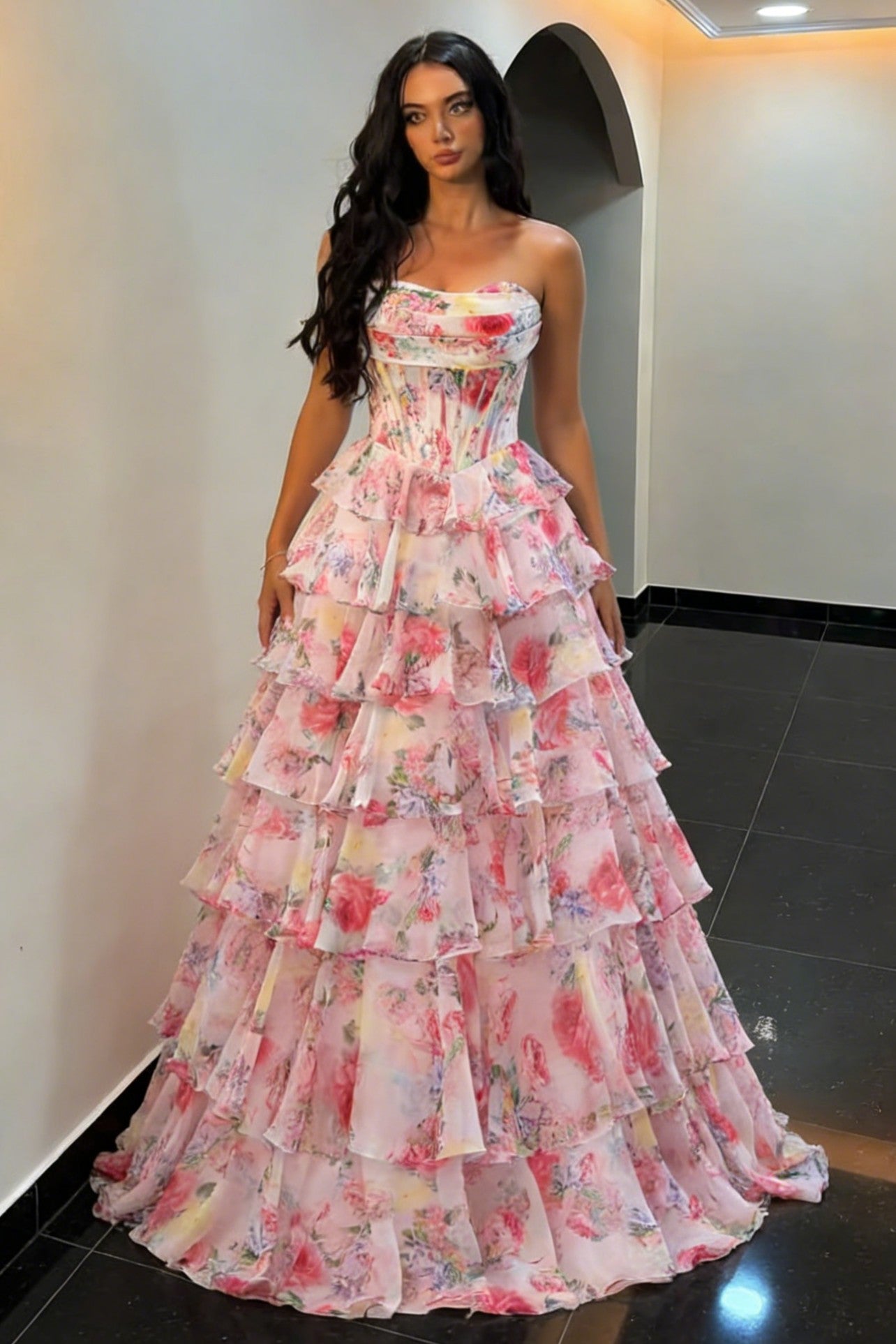 This Fairytale Pink Floral Strapless Prom Dress with Corset Bodice and Ruffle Skirt features a romantic strapless neckline and a structured corset bodice that beautifully shapes the figure. Delicate floral details add a dreamy, whimsical touch, while the flowing ruffle skirt creates soft movement and enchanting volume. Finished in a sweet pink hue, this gown is perfect for prom, formal events, and special occasions where fairytale elegance comes to life.