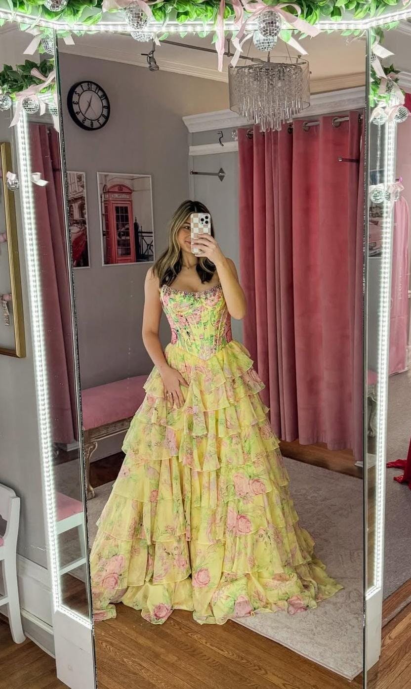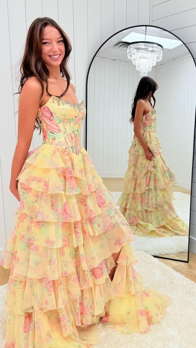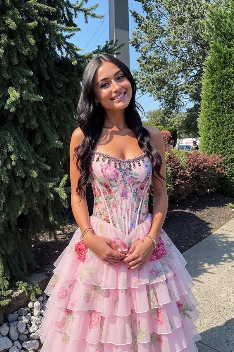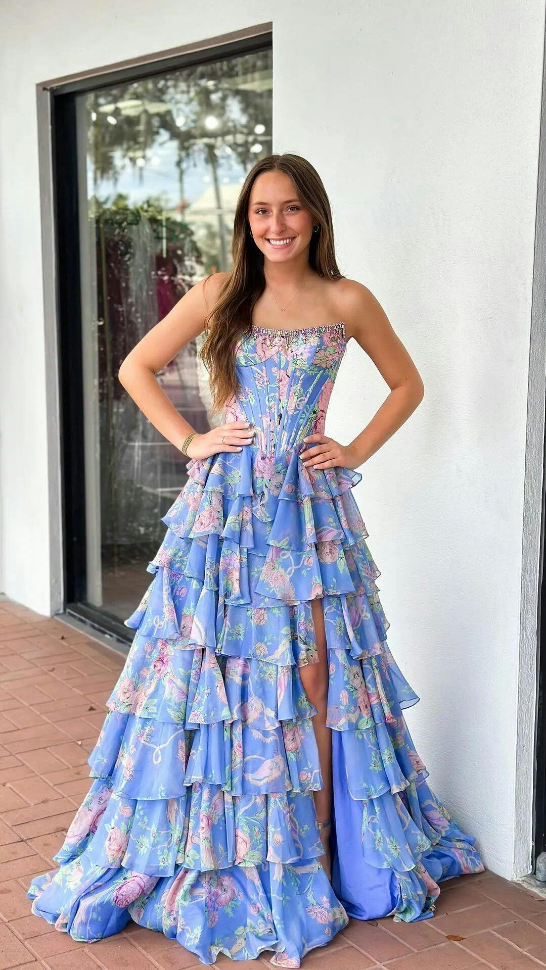 Turn heads in this stunning Floral Print Tiered Ruffle Prom Dress, designed for girls who want a dreamy, romantic look with a touch of sparkle. Featuring a shimmering corset bodice, this gown enhances your waistline while adding an elegant, glamorous glow. The floral print fabric brings a fresh, feminine vibe, perfectly paired with a tiered ruffle skirt that adds volume and movement with every step. A chic front slit completes the design, offering both comfort and a bold, modern twist. Ideal for prom, formal events, pageants, and spring or summer celebrations, this dress is the perfect blend of soft beauty and statement style.