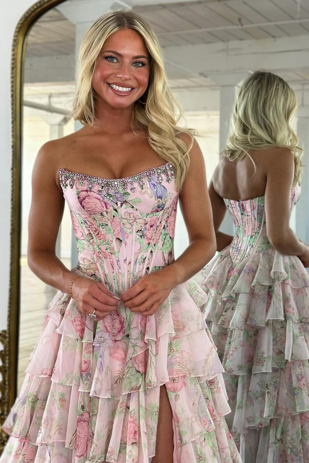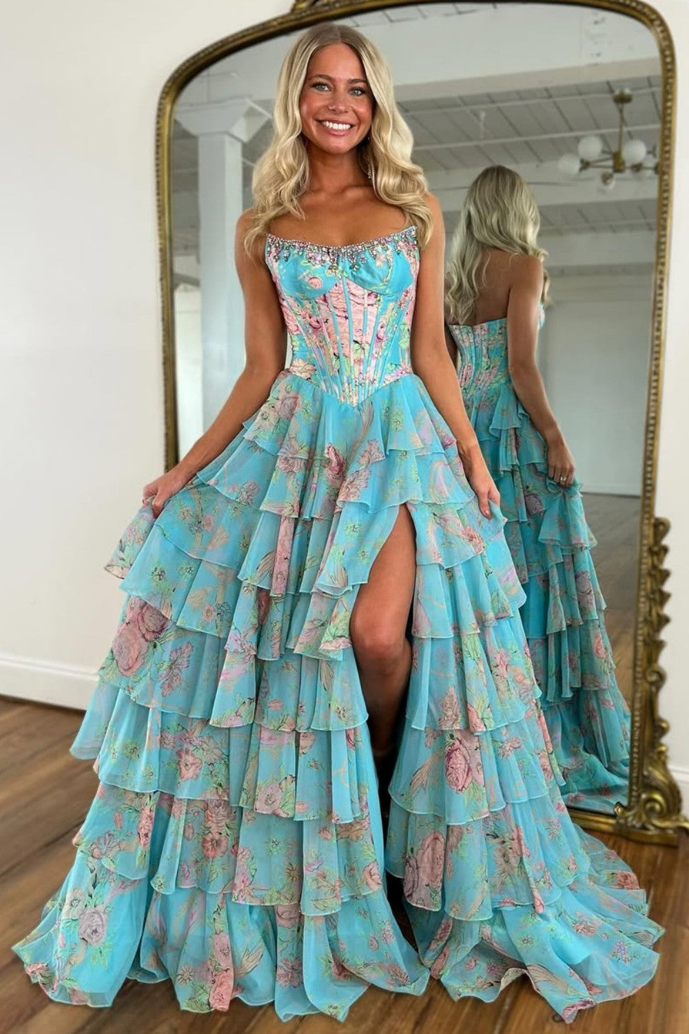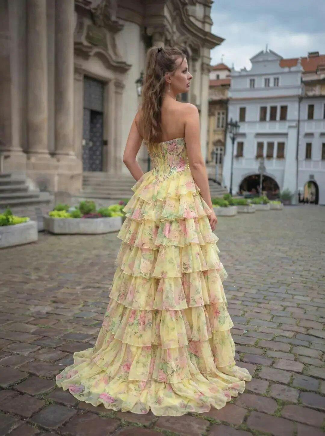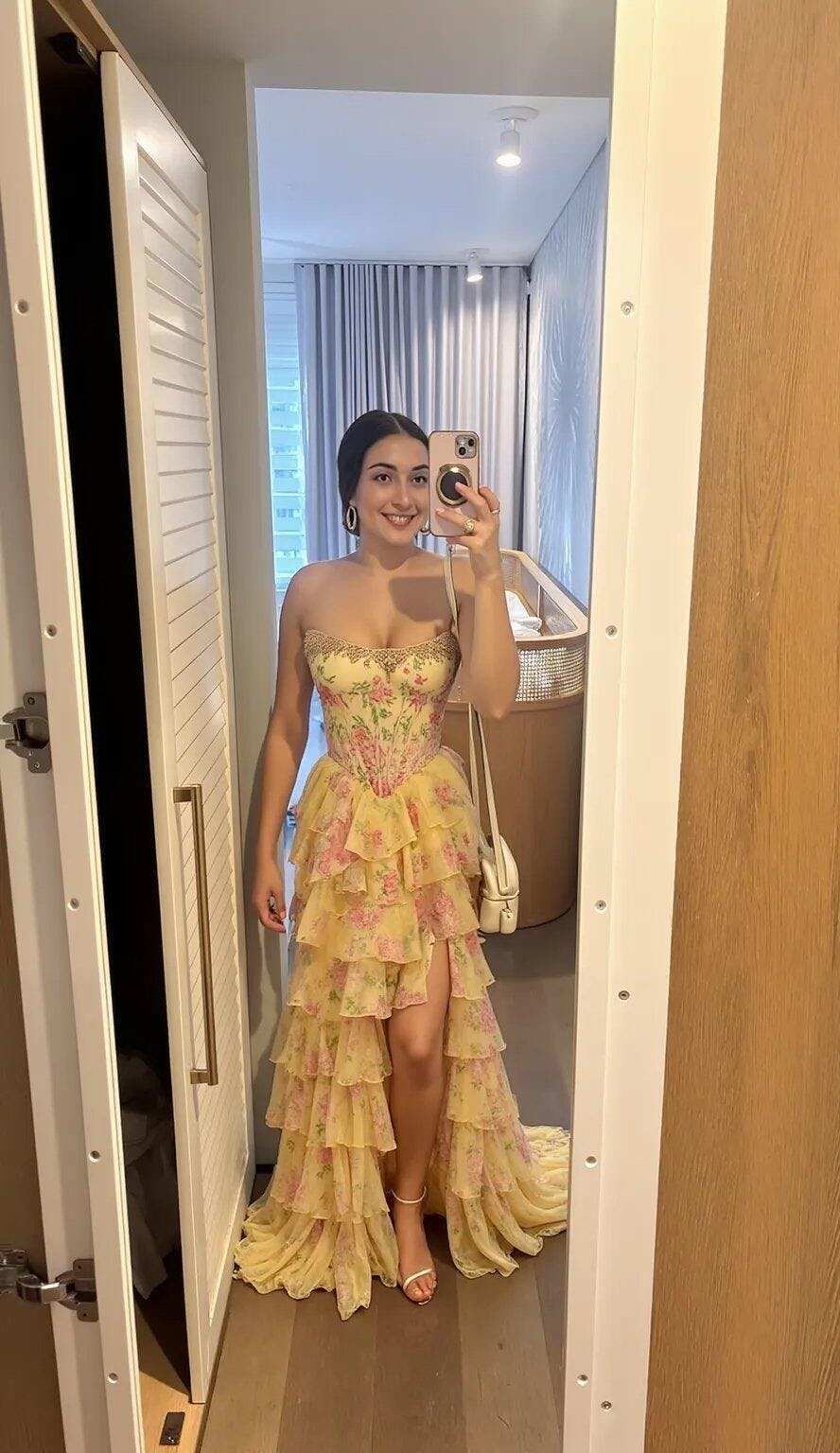 Turn heads in this stunning Floral Print Tiered Ruffle Prom Dress, designed for girls who want a dreamy, romantic look with a touch of sparkle. Featuring a shimmering corset bodice, this gown enhances your waistline while adding an elegant, glamorous glow. The floral print fabric brings a fresh, feminine vibe, perfectly paired with a tiered ruffle skirt that adds volume and movement with every step. A chic front slit completes the design, offering both comfort and a bold, modern twist. Ideal for prom, formal events, pageants, and spring or summer celebrations, this dress is the perfect blend of soft beauty and statement style.