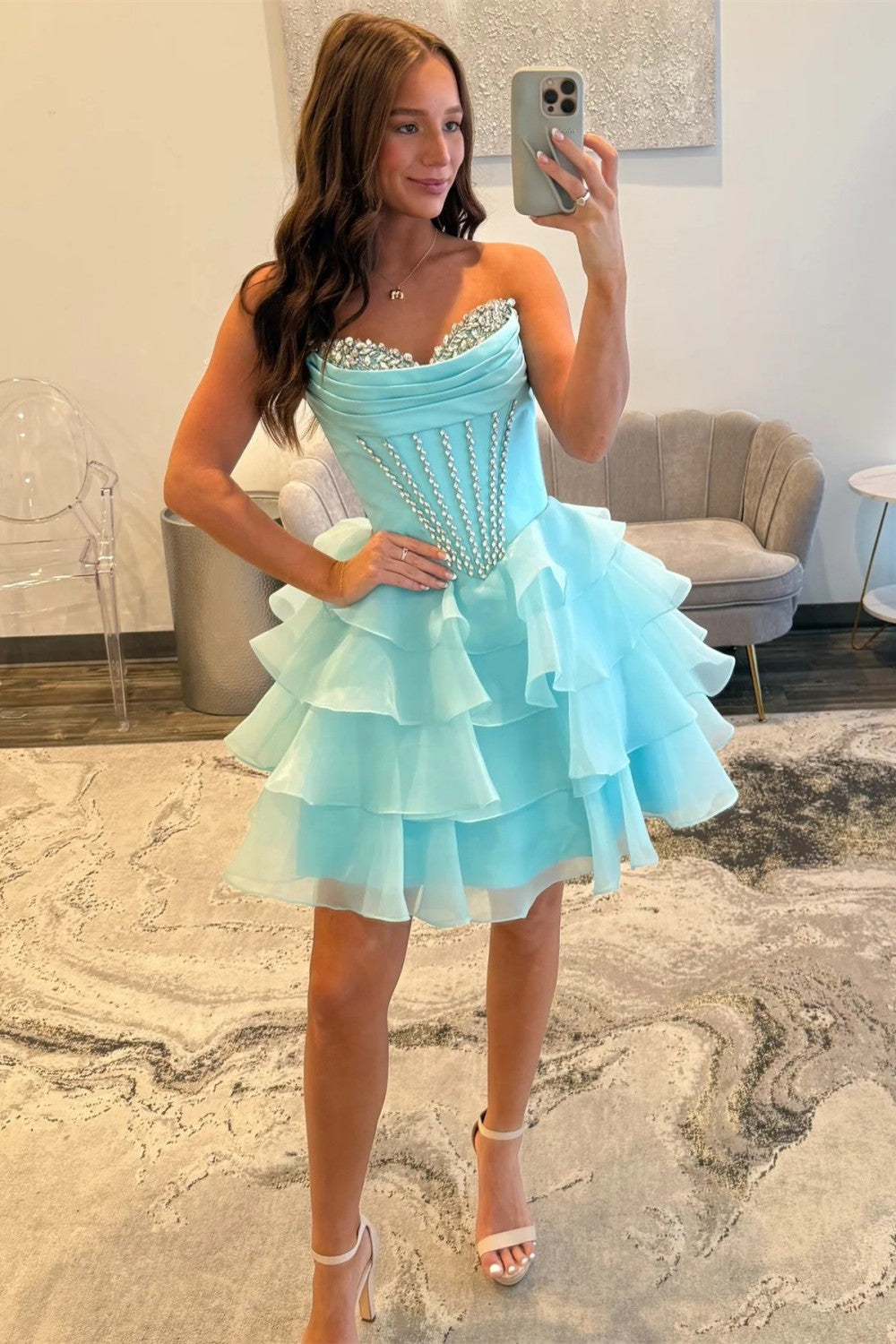Shine with playful elegance in this Glam Aqua Sweetheart Homecoming Dress featuring a dazzling rhinestone bodice that catches every light and a layered ruffle skirt that adds fun, flirty movement. The sweetheart neckline enhances the romantic vibe, making it the perfect choice for homecoming, parties, or any special night where you want to sparkle and stand out.