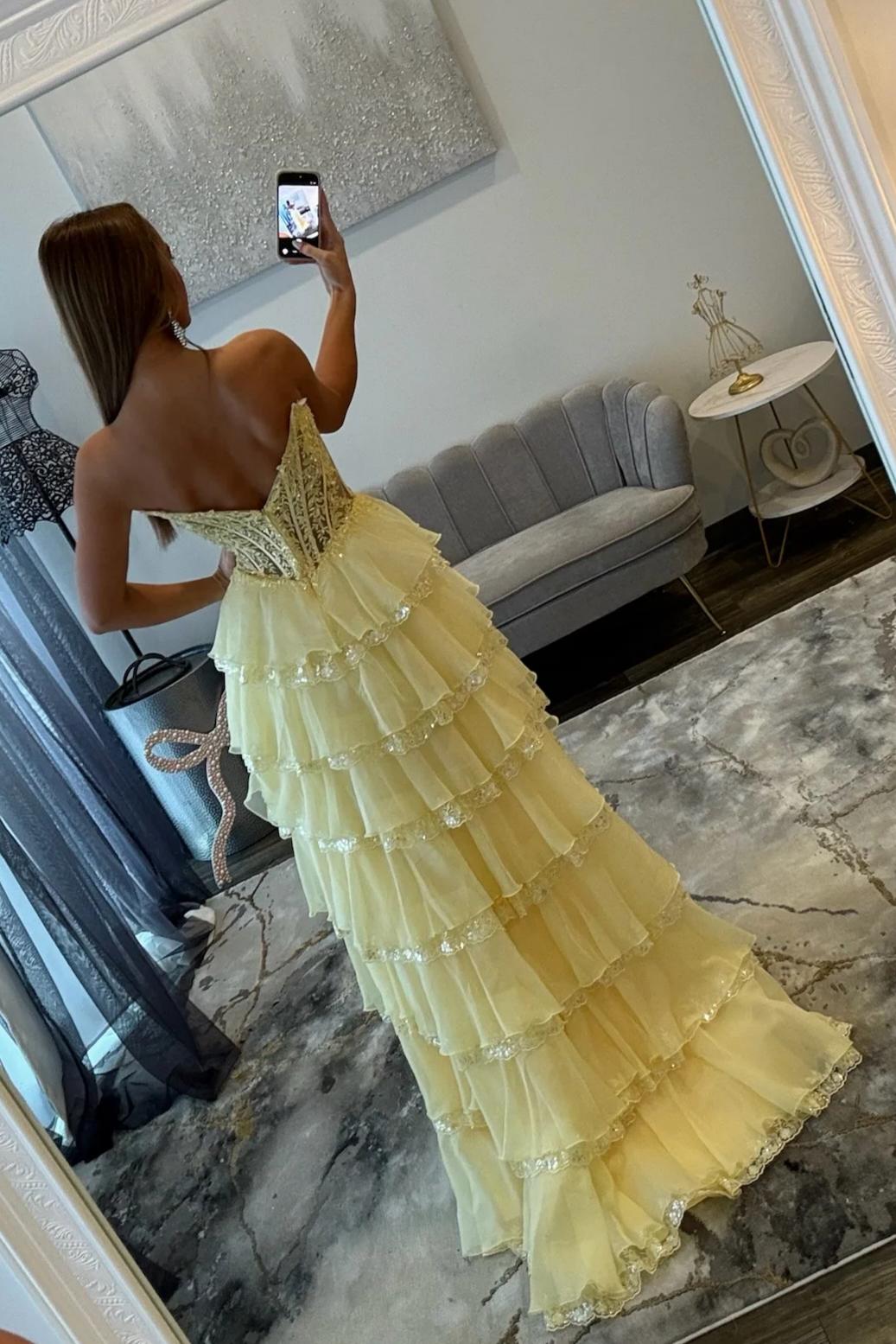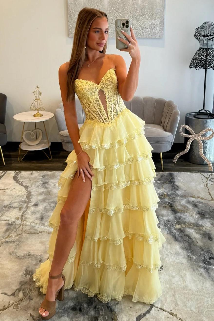 This Glamorous Light Blue Strapless Lace Corset Tiered Tulle Prom Dress with Slit features a romantic strapless neckline and a structured lace corset bodice that beautifully shapes the figure. The airy tulle skirt cascades in elegant tiers, creating graceful volume and movement, while the stylish slit adds a touch of modern allure. Finished in a soft light blue hue, this gown is perfect for prom, formal events, and special occasions where glamour meets dreamy elegance.