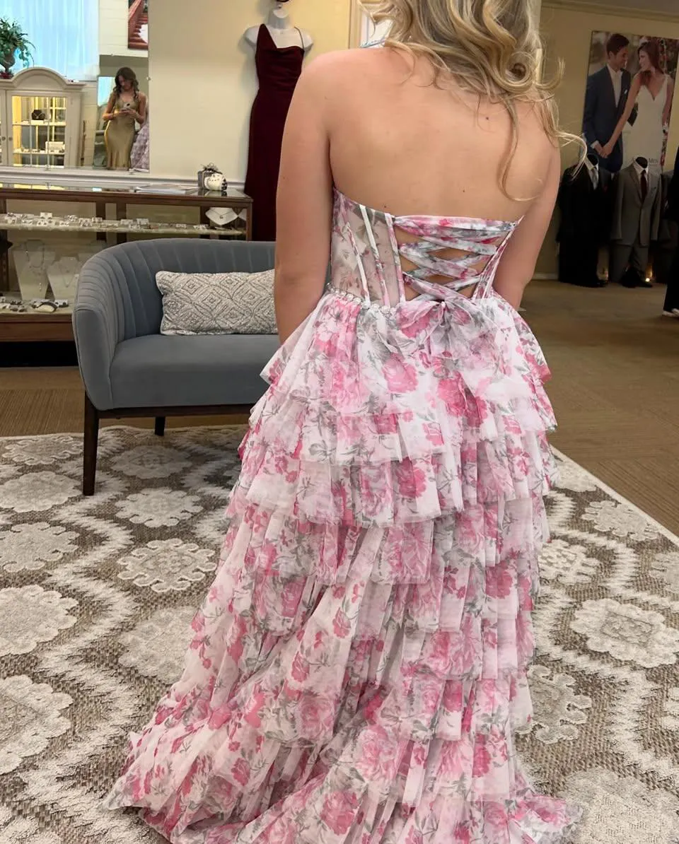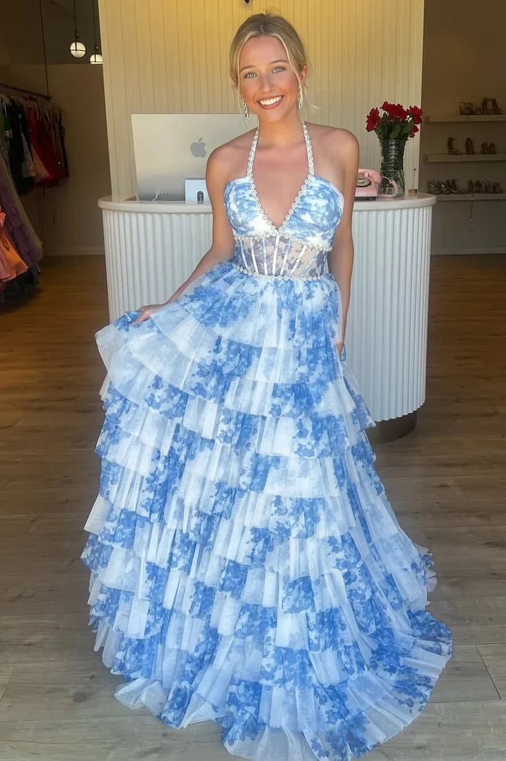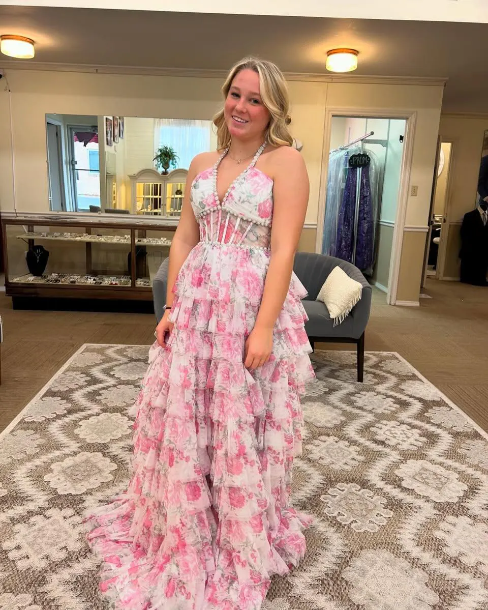 Bloom with elegance in this Gorgeous A-Line Halter Neck Pink Floral Printed Corset Prom Dress with Ruffles. The halter neckline beautifully frames your shoulders, while the fitted corset bodice sculpts your waist for a flattering, feminine silhouette. Flowing into an A-line skirt, the dress moves gracefully with every step, enhanced by soft ruffle accents that add romantic texture and charm. The delicate floral print in soft pinks adds a whimsical, fresh touch, perfect for standing out at prom or any special occasion. Elegant, playful, and unforgettable, this gown is designed to make your night truly magical.