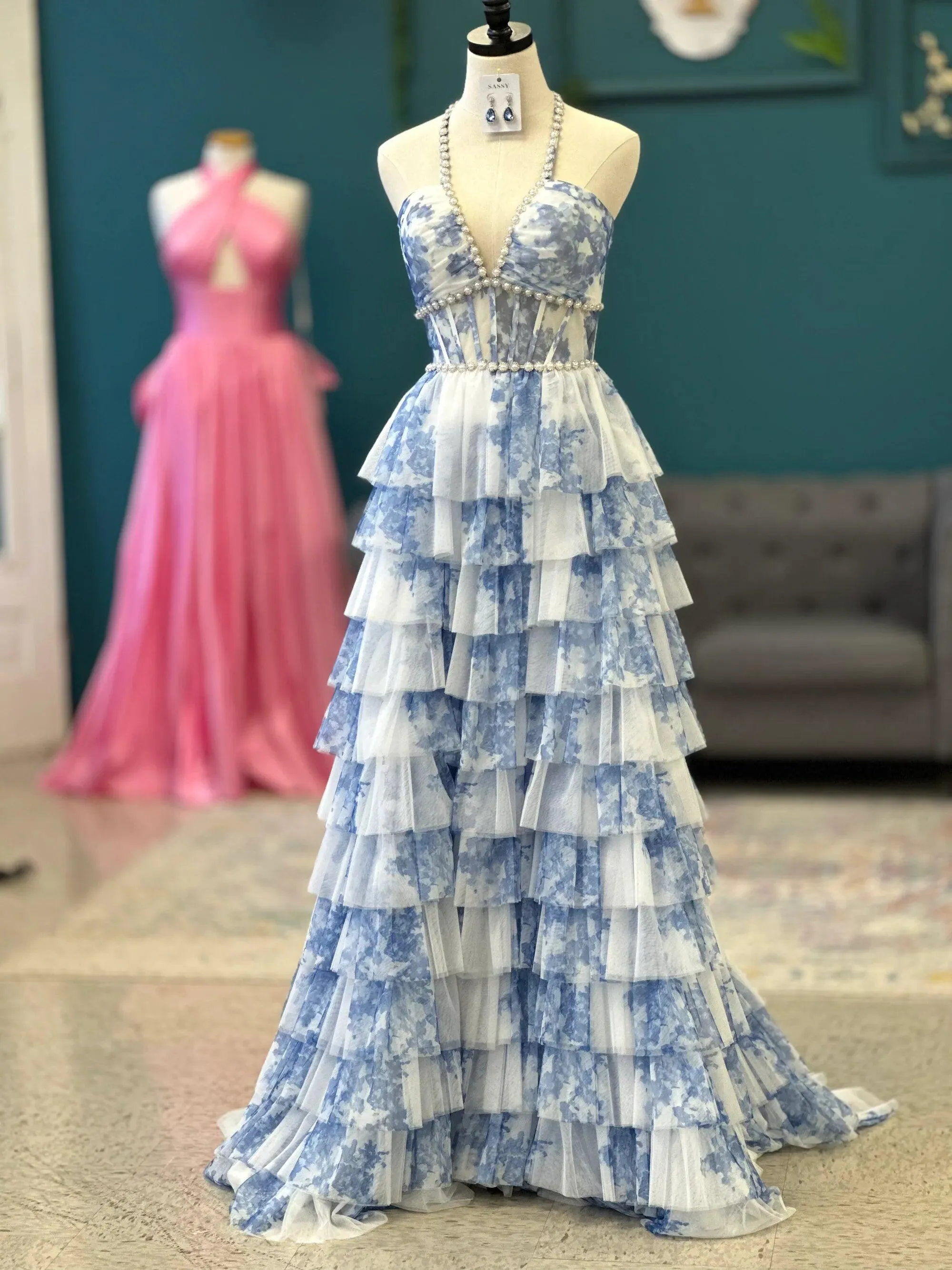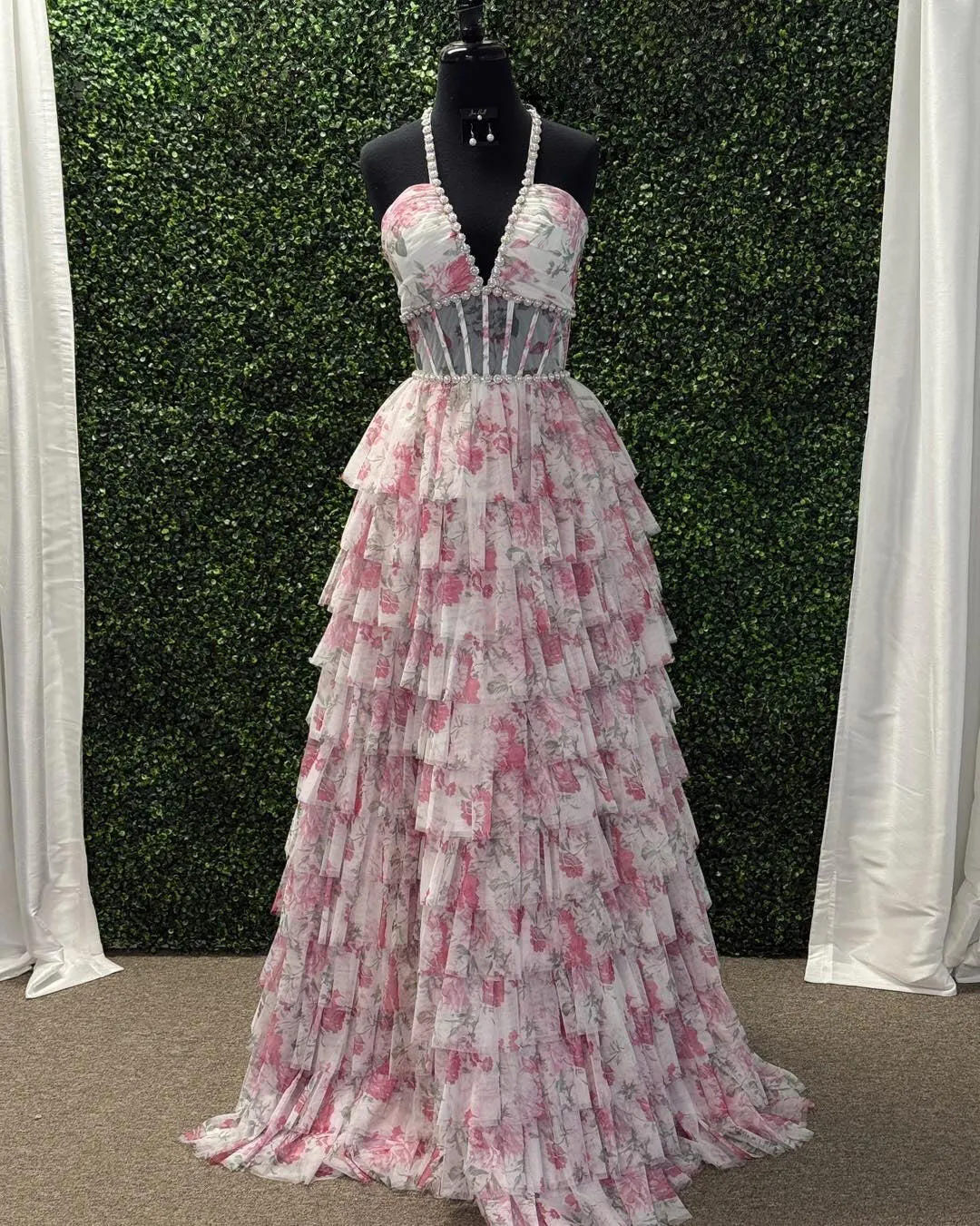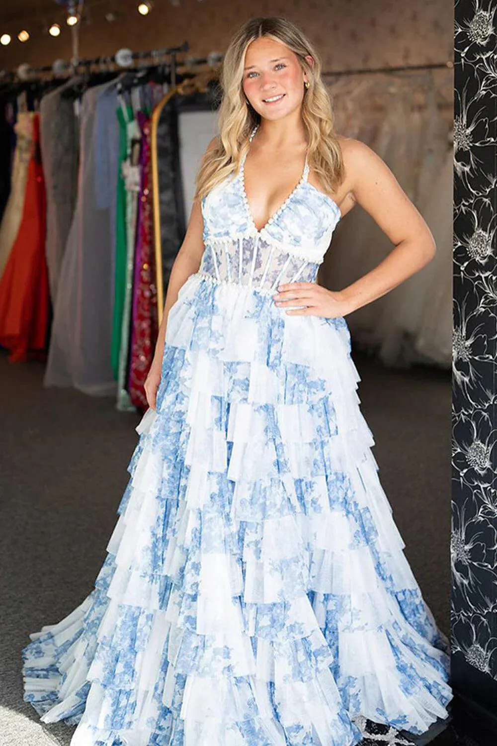 Bloom with elegance in this Gorgeous A-Line Halter Neck Pink Floral Printed Corset Prom Dress with Ruffles. The halter neckline beautifully frames your shoulders, while the fitted corset bodice sculpts your waist for a flattering, feminine silhouette. Flowing into an A-line skirt, the dress moves gracefully with every step, enhanced by soft ruffle accents that add romantic texture and charm. The delicate floral print in soft pinks adds a whimsical, fresh touch, perfect for standing out at prom or any special occasion. Elegant, playful, and unforgettable, this gown is designed to make your night truly magical.