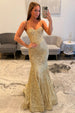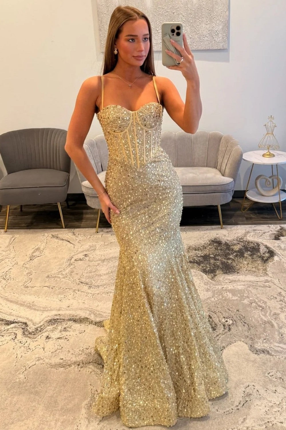 Shimmer with elegance in this stunning gold mermaid prom dress. Designed with delicate spaghetti straps and a structured corset bodice, it offers a flattering, sculpted fit that highlights your natural curves. The sparkly fabric catches the light beautifully, creating a radiant, glamorous look from every angle. Finished in a sleek mermaid silhouette, this gown is perfect for prom, formal events, or any special occasion where you want to shine with confidence and sophistication.
