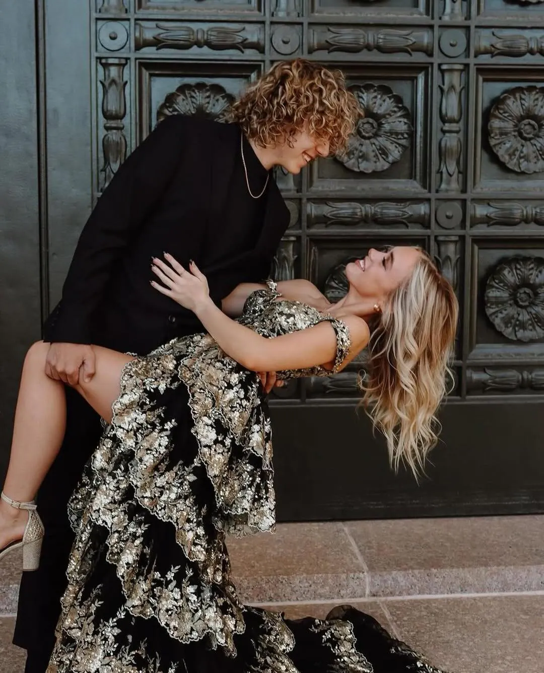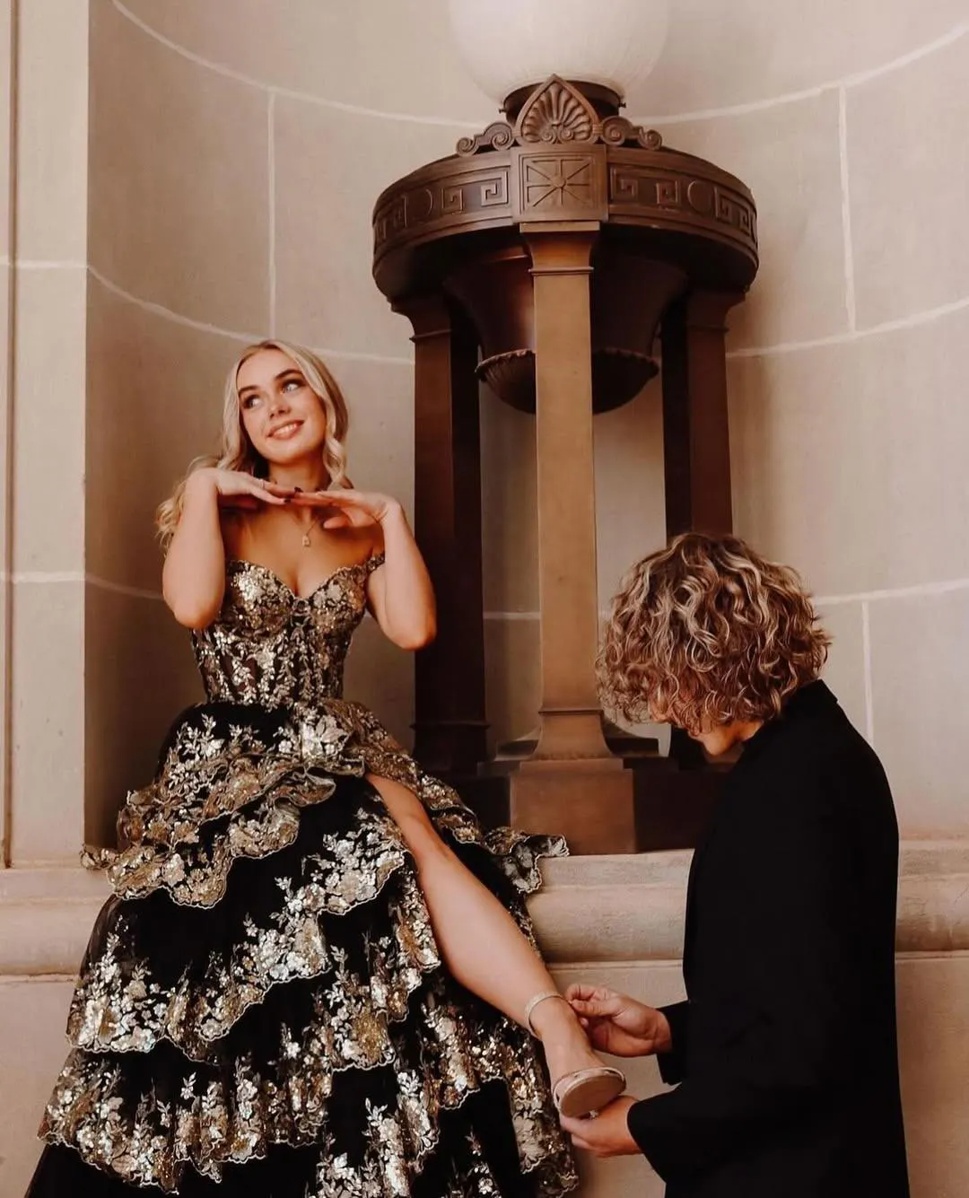 Turn heads in this Gorgeous A-Line Off The Shoulder Long Tiered Prom Dress with Sequined Appliques. The off-the-shoulder neckline adds a touch of romance and elegance, beautifully framing your shoulders and collarbone. The A-line silhouette provides a flattering fit for every body shape, gracefully cascading down into a luxurious, tiered skirt that moves effortlessly with each step. Intricate sequined appliques adorn the bodice and skirt, adding a dazzling touch of sparkle and glamour. Perfect for prom or any formal event, this dress combines timeless sophistication with a hint of glamour, ensuring you make a memorable entrance and leave a lasting impression.
