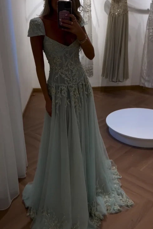 Step into enchanting elegance with this gorgeous A-line prom dress. Featuring a romantic sweetheart neckline, it beautifully frames the décolletage while creating a flattering, feminine silhouette. Crafted in a soft light green hue, the flowing long skirt is adorned with delicate appliqués that add texture and sophisticated charm. Perfect for prom, formal events, or special occasions, this dress blends timeless beauty with graceful style.
