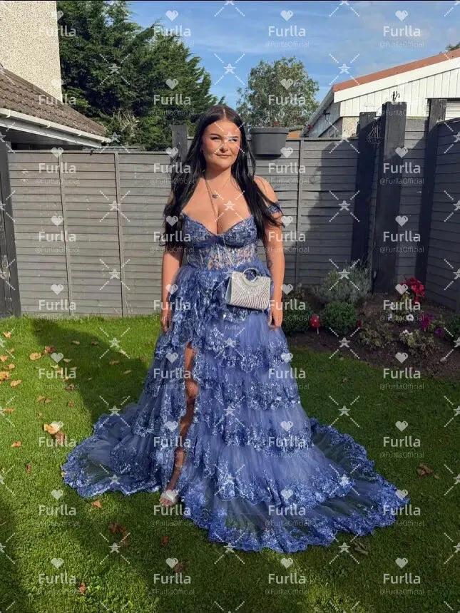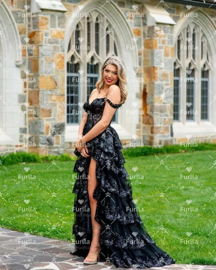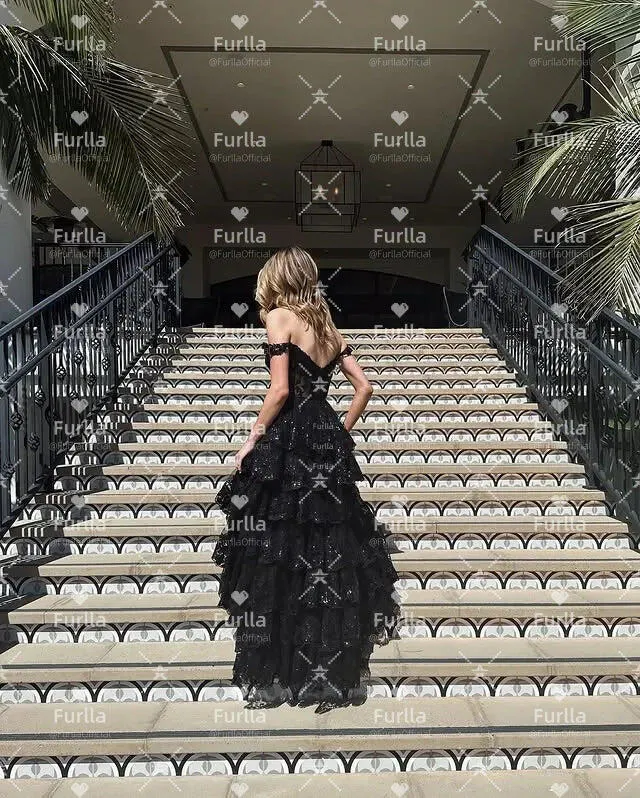 Shine like a star in this Gorgeous Glitter A-Line Off-the-Shoulder Prom Dress. Designed with shimmering tiered layers of sequin tulle, this gown features a romantic off-the-shoulder neckline and a flattering A-line silhouette that flows with every step. The high slit adds a bold touch, making it the perfect statement piece for prom or any glamorous evening event.