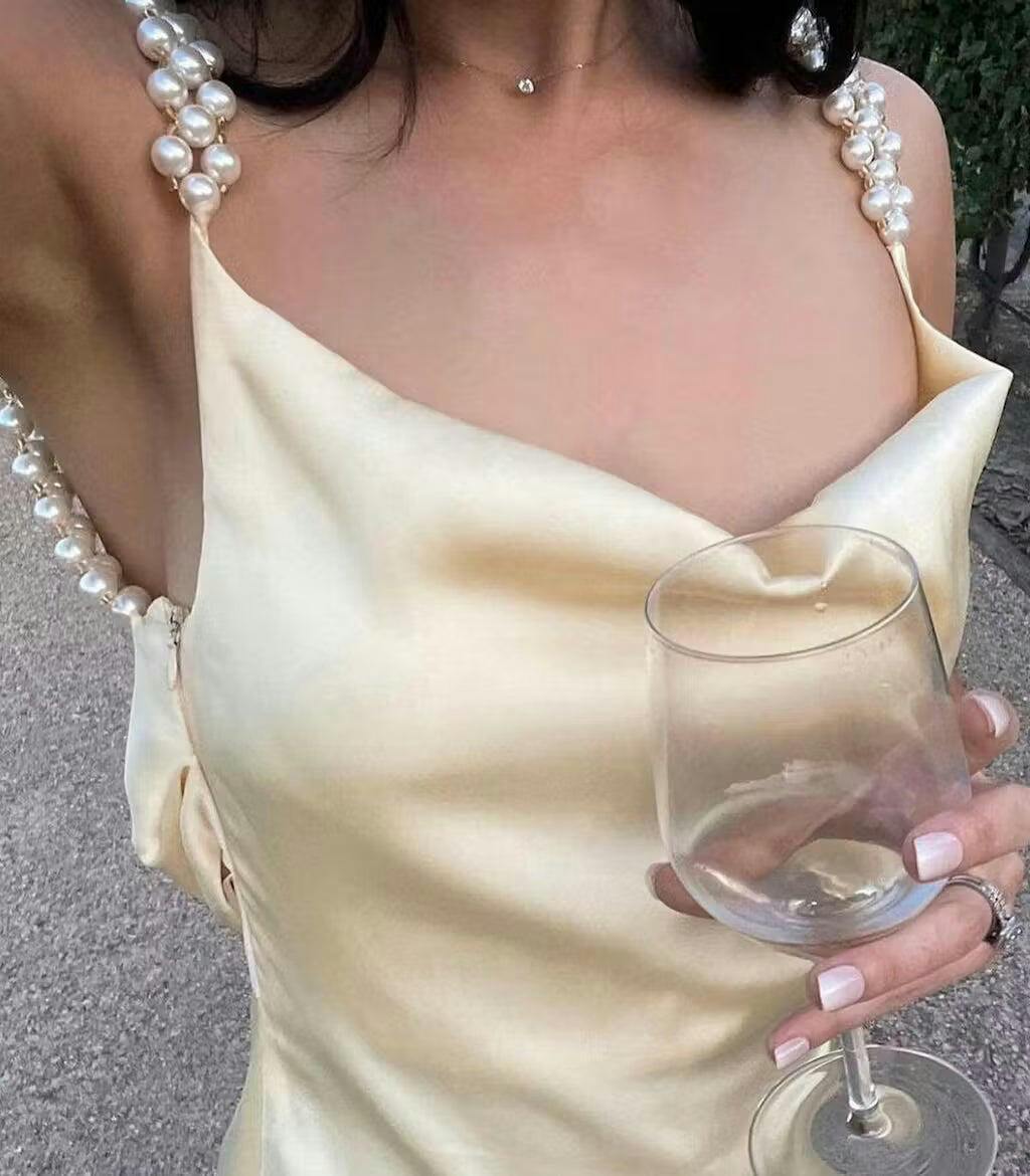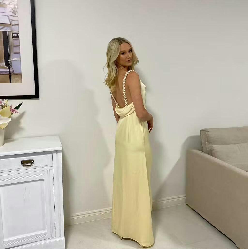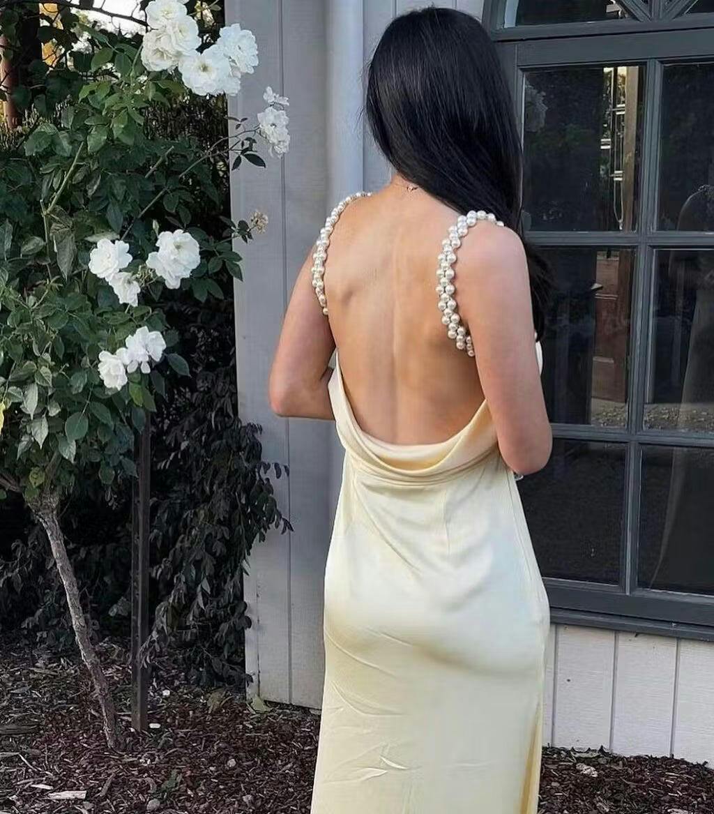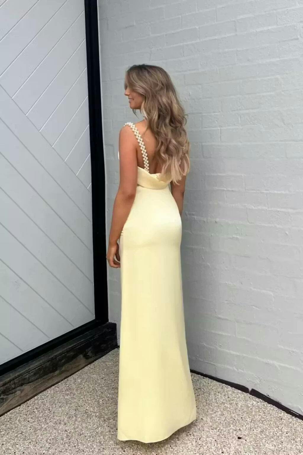 Turn heads in this stunning yellow sheath party dress, designed for elegance and allure. The sleek silhouette hugs your curves, while the delicate spaghetti straps add a touch of sophistication. The true showstopper is the open back adorned with pearl detailing, creating a breathtaking, luxurious finish. Made from high-quality fabric that flows effortlessly, this long evening gown is perfect for proms, formal events, and special occasions where you want to make a statement. Elegant, radiant, and timeless—this dress ensures all eyes will be on you!