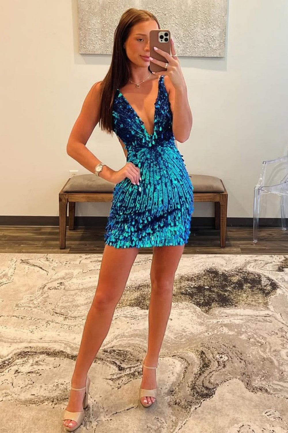 Gorgeous sparkly deep V-neck sequin mini tight homecoming dress featuring a curve-hugging fit and shimmering allover sequins. The plunging neckline adds a bold, flirty touch, making it perfect for homecoming, parties, or any night you want to stand out in style.
