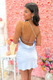 Glow in icy elegance with this satin mini homecoming dress. The cowl back adds a graceful drape, while delicate pearl straps bring a touch of sophistication and charm. Its ice blue hue and sleek silhouette make it perfect for homecoming, parties, or any special occasion where you want to shine.