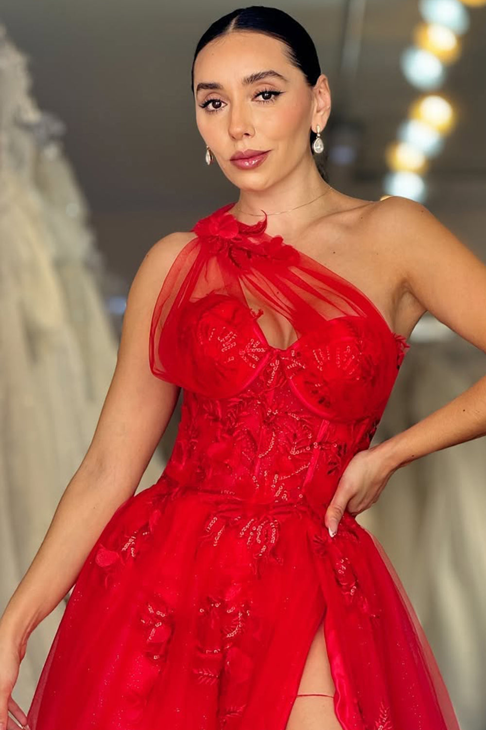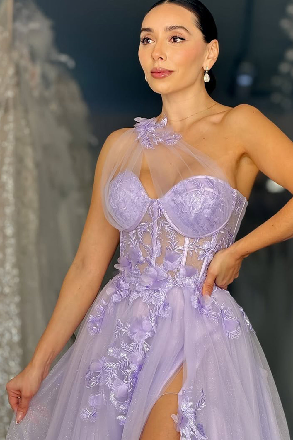 Embrace romantic elegance in this lavender one-shoulder prom gown. The delicate floral appliqués add texture and whimsy, while the airy tulle skirt creates a dreamy, ethereal look. A striking high slit adds modern allure and graceful movement, making this gown perfect for prom, galas, or any formal event where you want to captivate with soft sophistication.