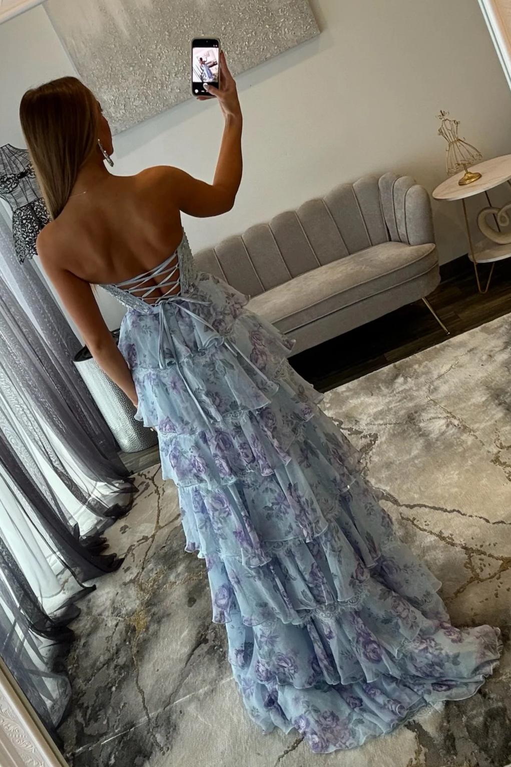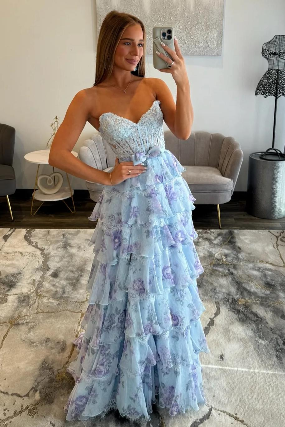 This Light Blue A-Line Floral Tiered Ruffle Corset Prom Dress with Slit and Lace-Up Back features a romantic corset bodice that beautifully shapes the figure, paired with a lace-up back for an adjustable, flattering fit. Delicate floral details and tiered ruffle layers create soft movement and a dreamy silhouette, while the flowing A-line skirt and stylish slit add elegance and modern allure. Finished in a gentle light blue hue, this gown is perfect for prom, formal events, and special occasions where graceful femininity shines.