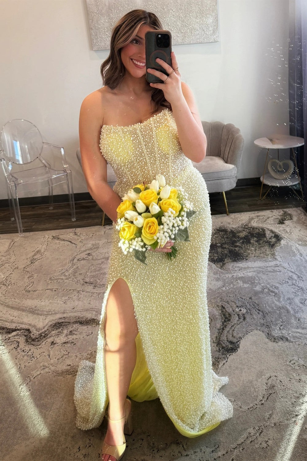 Radiate elegance and glamour in this stunning light blue mermaid prom dress. Designed with a strapless neckline, it beautifully highlights your shoulders and décolletage, while the figure-hugging mermaid silhouette enhances your curves. Sparkly embellishments and delicate pearl details add luxurious shine, catching the light from every angle. A daring high slit brings modern allure and effortless movement, making this gown a perfect choice for prom, formal events, or any night you want to make a memorable impression.