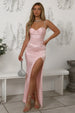 This Light Pink Satin Corset Prom Dress with Crystal Spaghetti Straps & High Slit features a structured corset bodice that enhances the silhouette and delicate crystal spaghetti straps that add a touch of sparkle. Crafted in smooth satin, the gown is finished with a bold high slit for elegant movement and modern allure, making it perfect for prom and formal occasions.