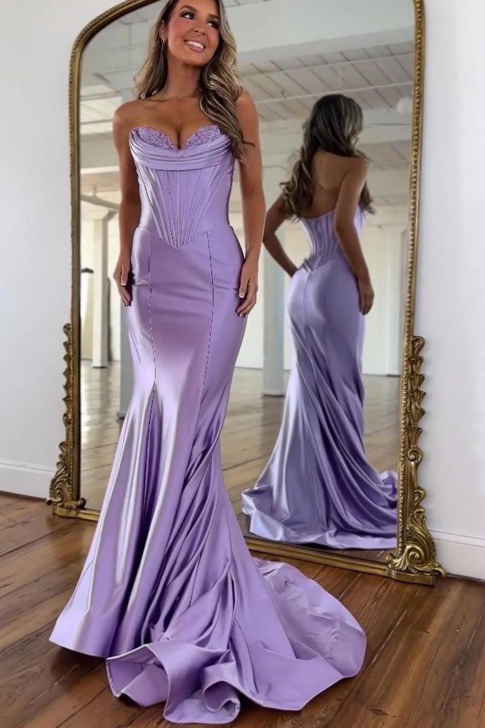 Step into sleek elegance with this lilac satin mermaid prom dress. Designed with a strapless neckline, it beautifully highlights the shoulders and neckline, creating a timeless and refined look. The structured corset bodice shapes and supports the figure, while the smooth satin fabric adds a luxurious sheen. Finished in a flattering mermaid silhouette, this gown is perfect for prom night or any formal occasion that calls for modern sophistication and feminine charm.