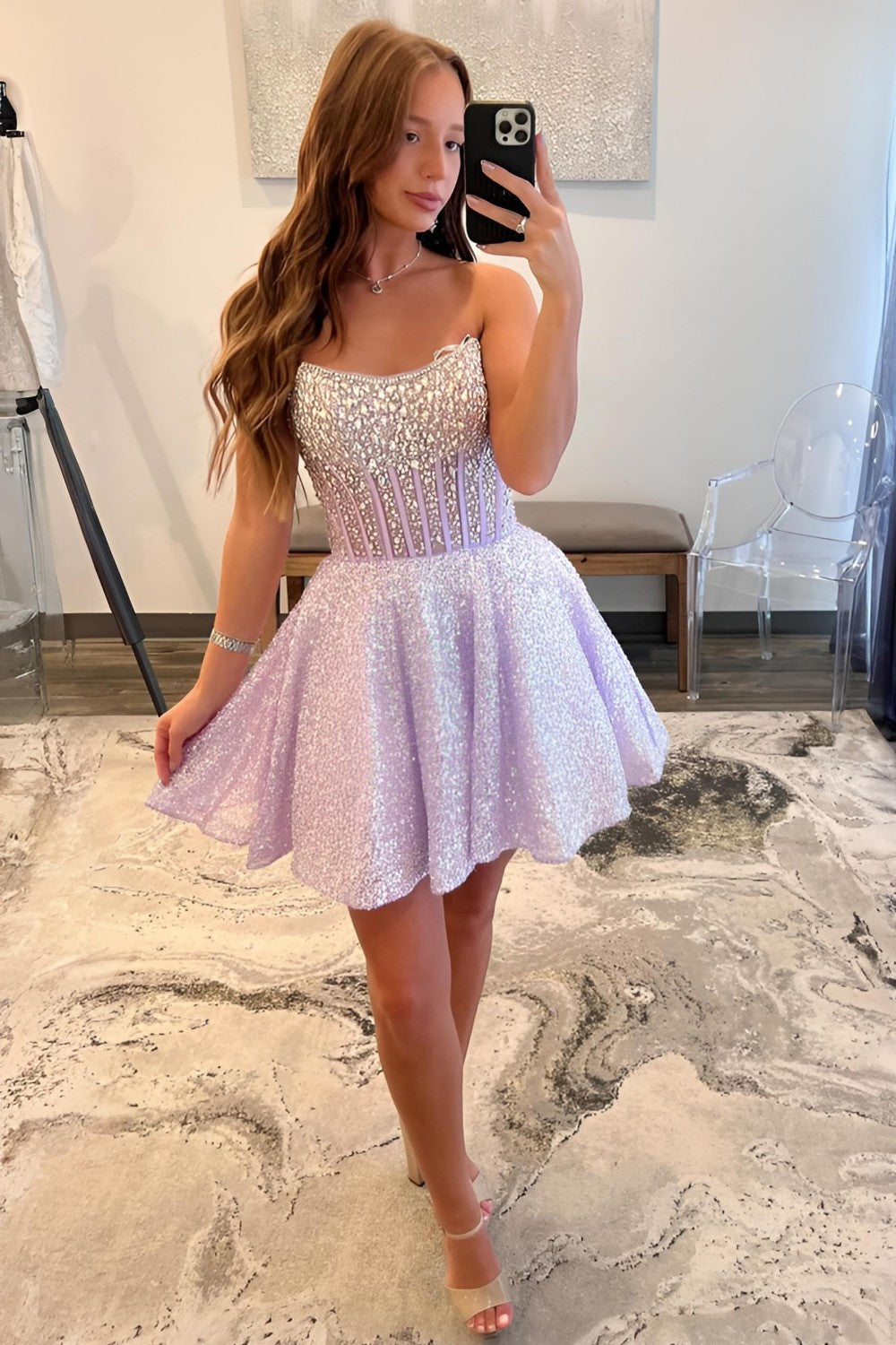 Make a dazzling entrance in this enchanting lilac homecoming dress, crafted with shimmering sequins and a flattering fit and flare silhouette. The structured rhinestone corset bodice adds a touch of elegance and sparkle, while the flared skirt moves beautifully with every step. Perfect for dancing the night away, this stunning design is both playful and glamorous, making it an unforgettable choice for your special night.