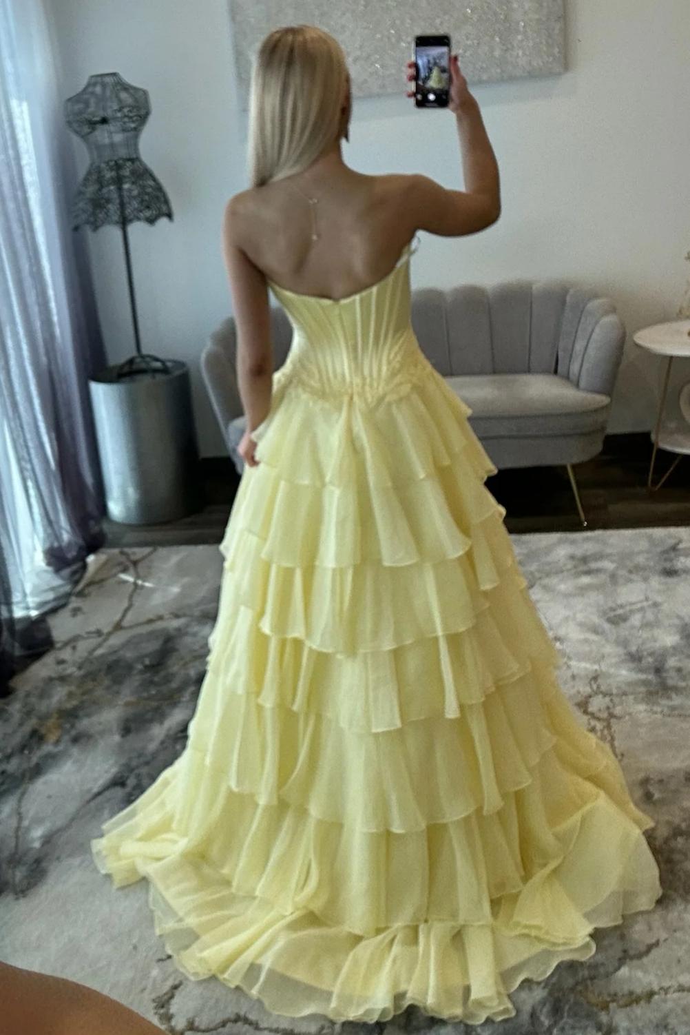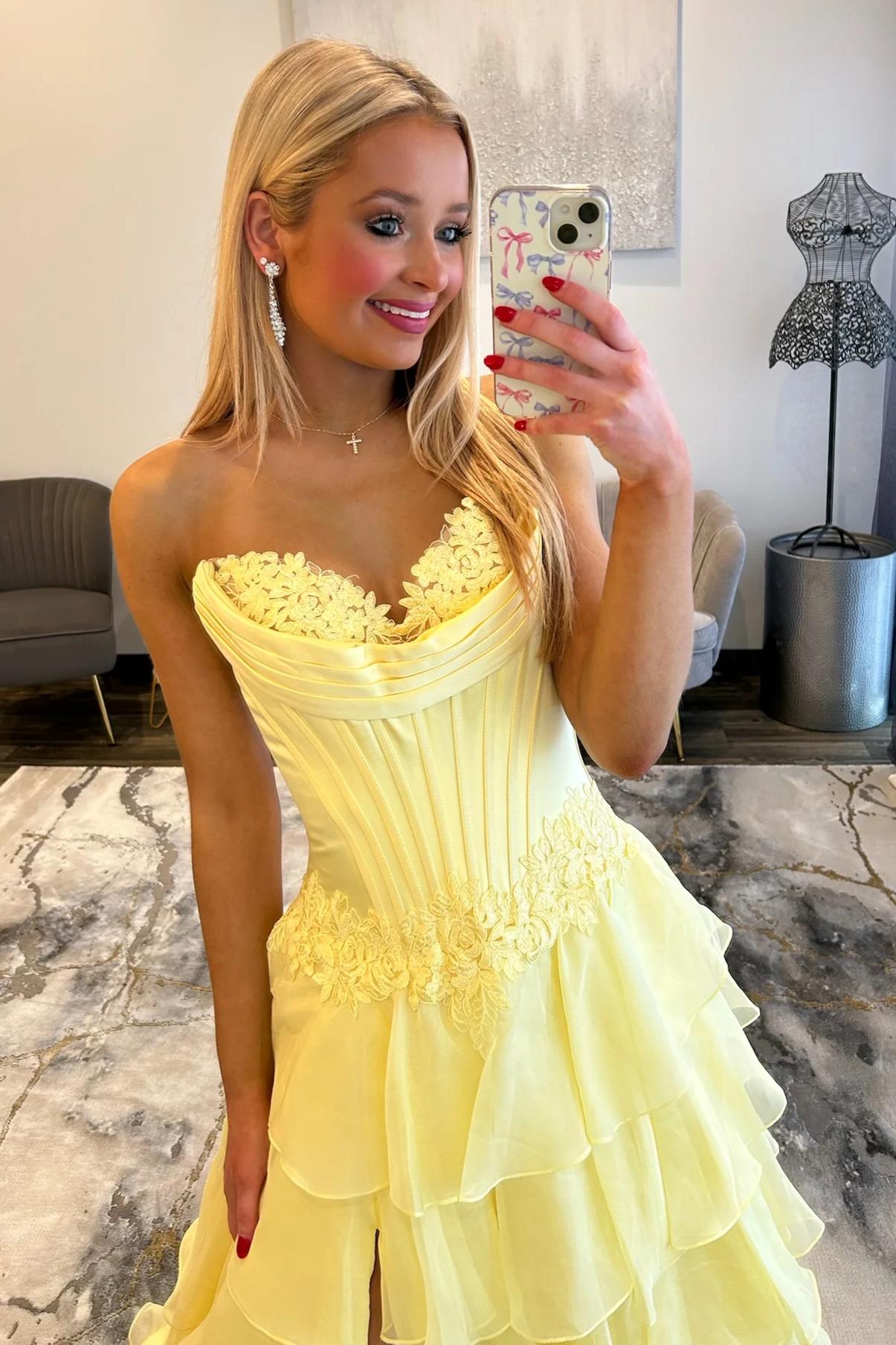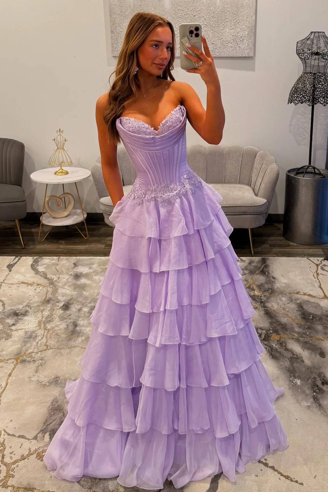 This Lovely Sweetheart A-Line Corset Ruffle Prom Dress with High Slit and Appliqués features a romantic sweetheart neckline and a structured corset bodice that beautifully shapes the figure. Delicate appliqués add elegant detail, while soft ruffle accents create graceful movement throughout the flowing A-line skirt. Finished with a stylish high slit for a modern touch, this gown is perfect for prom, formal events, and special occasions where feminine charm meets refined elegance.