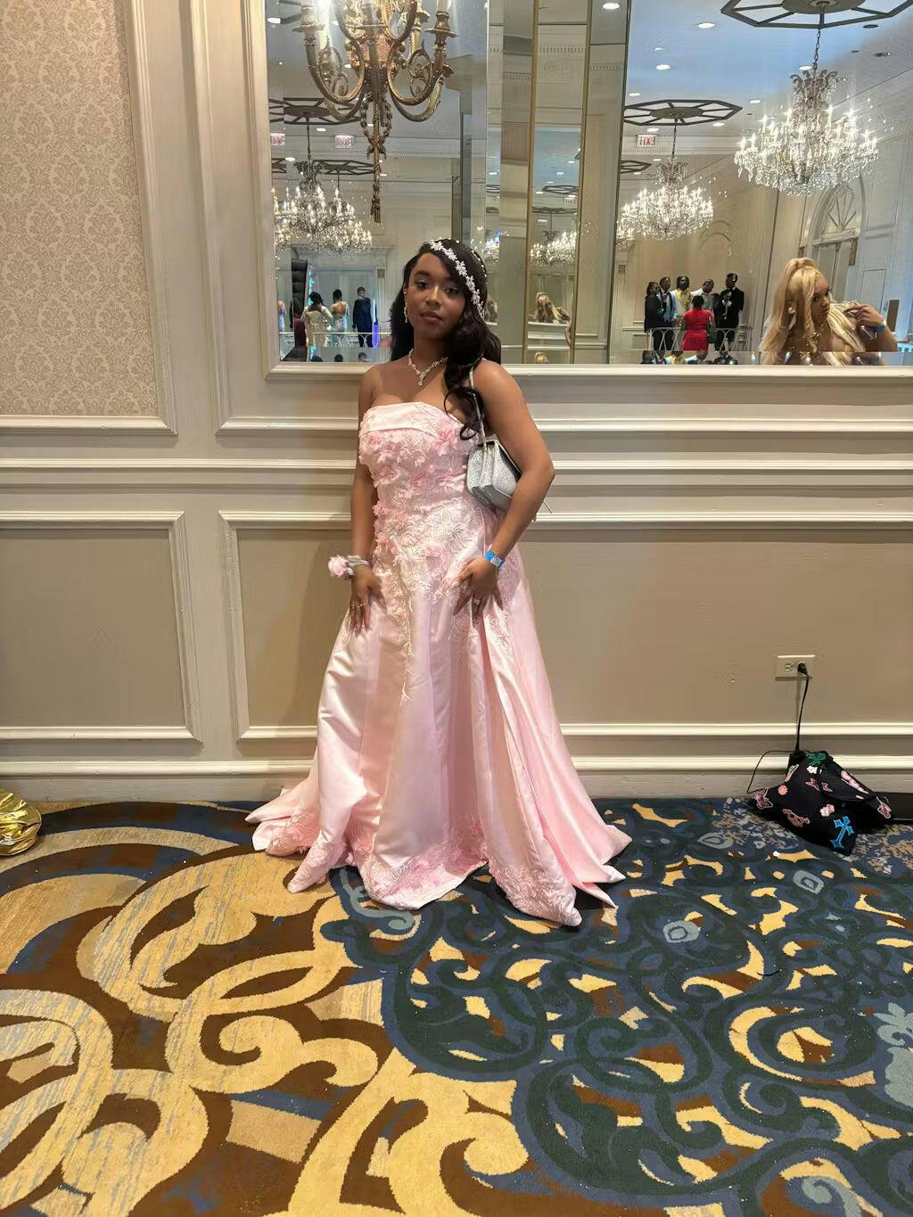 This stunning gown features a classic A-line silhouette that gracefully flows to the floor, offering a flattering fit for all body types. The strapless design highlights your shoulders and collarbones, while the rich satin fabric adds a luxurious sheen and timeless appeal. Intricate appliques embellish the bodice and skirt, adding texture and delicate detail to this already breathtaking dress. The court train enhances the dramatic effect, giving you a royal and graceful presence as you move. Perfect for formal events, galas, or any occasion that demands glamour, this dress will make you feel like the belle of the ball.