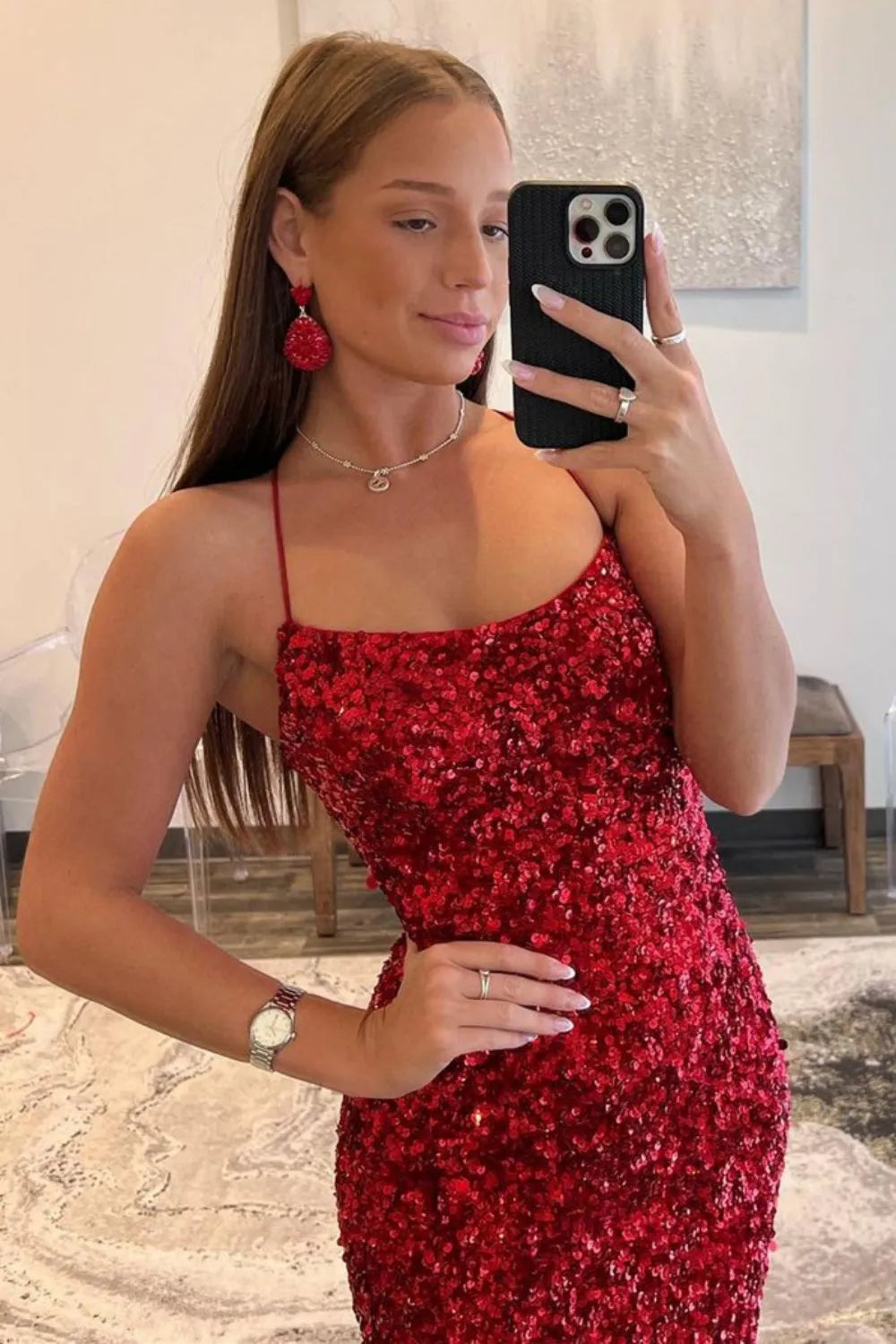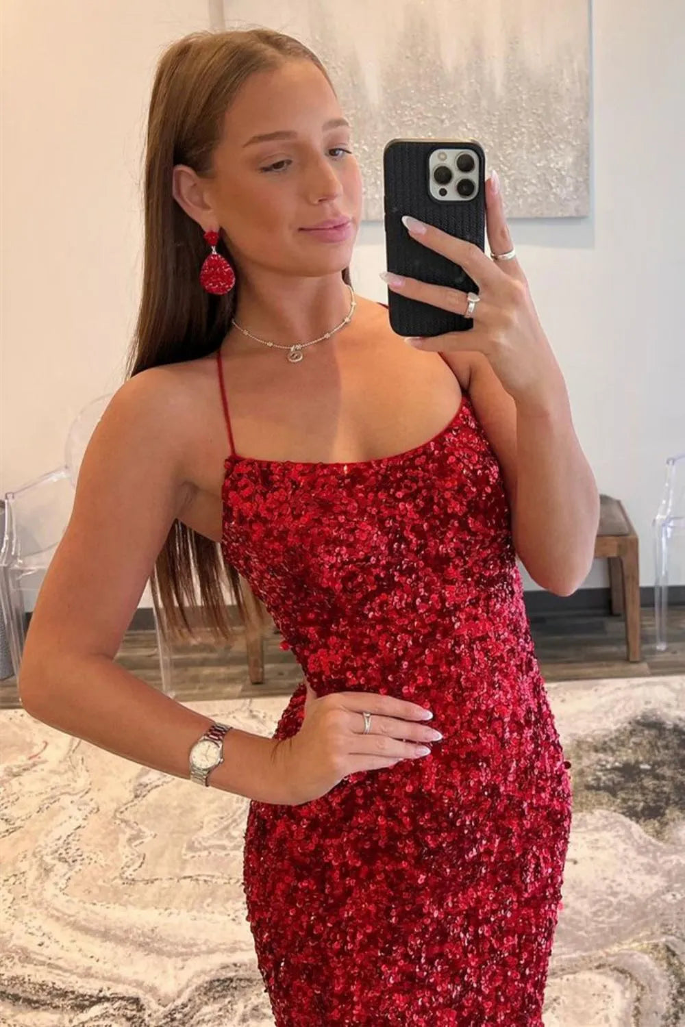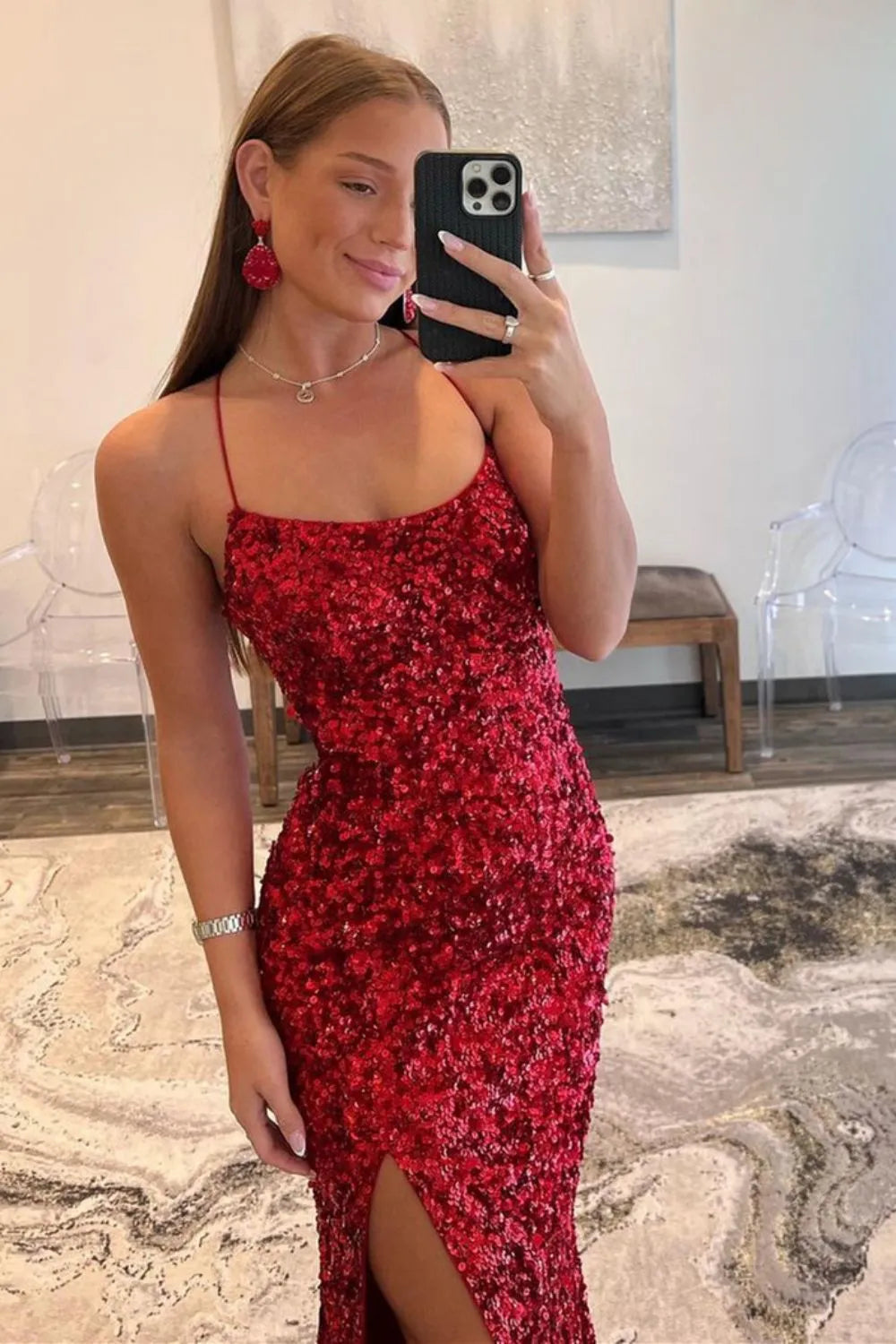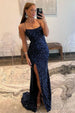 Shimmer with sophisticated glamour in this navy fitted sequin prom dress, designed to hug your curves with a sleek, body-skimming silhouette. The delicate spaghetti straps frame your neckline beautifully, while the allover sequins create an eye-catching sparkle from every angle. A chic side slit adds effortless movement and a touch of modern allure, balancing elegance with just the right amount of drama. Perfect for prom, galas, and evening events, this gown ensures a stunning, unforgettable entrance.