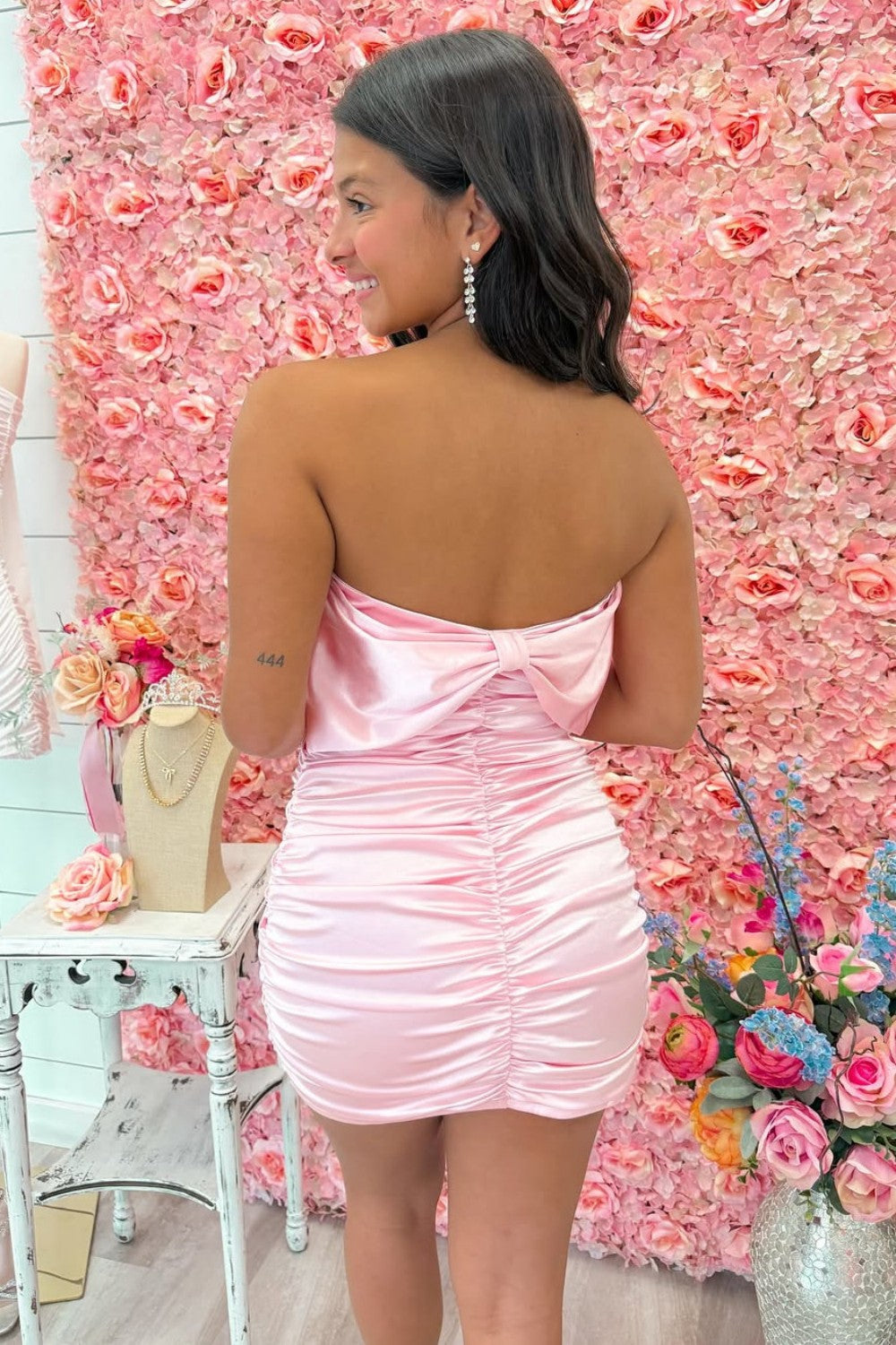 Pink satin strapless mini homecoming dress featuring a chic bow back and a flattering ruched skirt. The smooth satin fabric adds a touch of elegance, while the playful bow and ruching create a feminine, stylish silhouette—perfect for homecoming, parties, or special occasions.