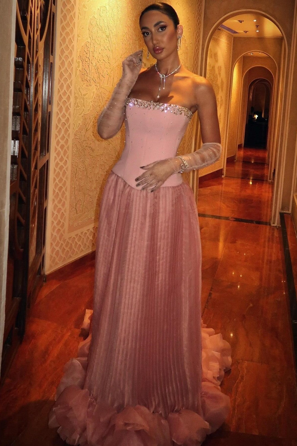 Step into fairytale elegance with this pink strapless prom dress, featuring a beautifully structured corset bodice adorned with shimmering beadwork for a radiant, eye-catching finish. The fitted top transitions into a soft, voluminous tulle skirt that adds dreamy movement and princess-worthy charm. Feminine, graceful, and effortlessly enchanting, this gown is perfect for prom, formals, and any special event where you want a romantic and unforgettable entrance.