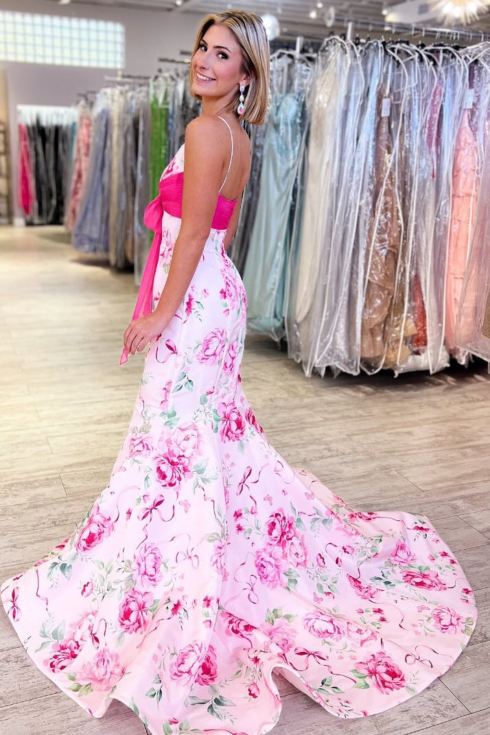 Turn heads in this Pretty Mermaid Spaghetti Straps Pink Printed Long Prom Dress with Bowknot. Featuring delicate spaghetti straps, this charming gown highlights the shoulders and neckline for a soft, feminine look. The fitted mermaid silhouette hugs your curves and flares elegantly at the hem, creating a graceful and sophisticated finish.