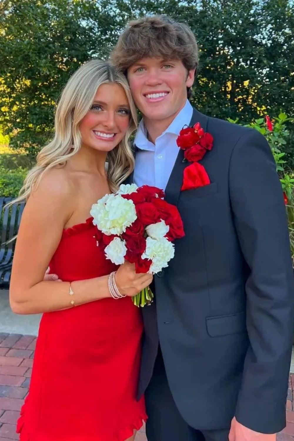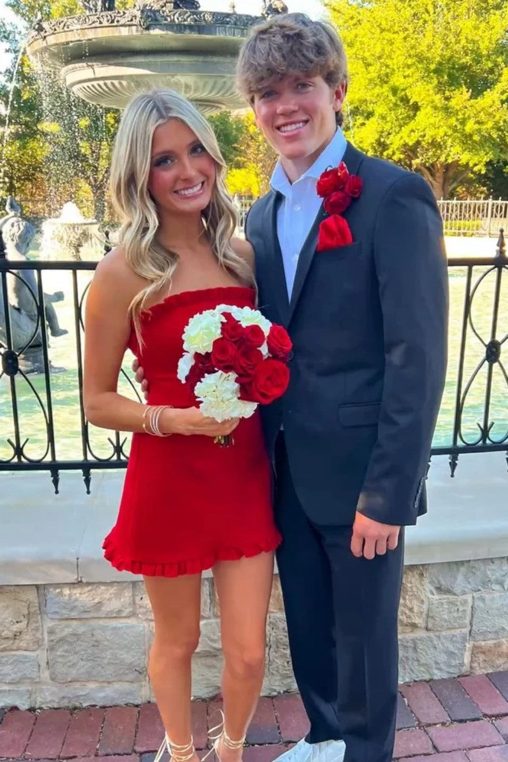 Make a bold statement in this Pretty Sheath Strapless Red Satin Short Homecoming Dress with Ruffles. Crafted from sleek satin, this dress hugs your figure in a chic sheath silhouette while the strapless neckline adds timeless elegance. The rich red shade exudes confidence and charm, while playful ruffle details bring a flirty, feminine touch. Perfect for homecoming, parties, or special nights out, this dress is designed to keep all eyes on you.