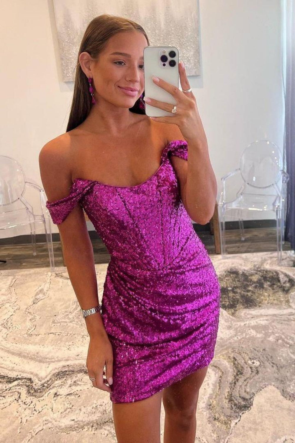 Glow with glamour in this Purple Sparkly Sequin Off The Shoulder Short Homecoming Party Dress featuring shimmering sequin fabric, a flattering off-the-shoulder neckline, and a fitted silhouette that highlights your curves. Perfect for homecoming, parties, or any special night where you want to sparkle with elegance and confidence.