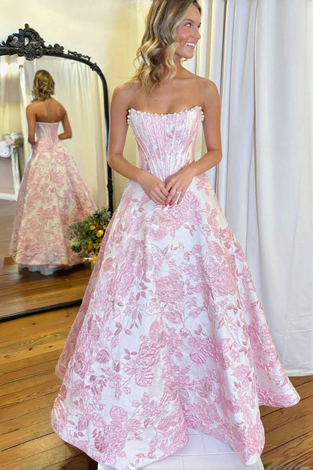 Make a fairytale entrance in this romantic strapless ball gown prom dress. Crafted from luxurious floral jacquard fabric, it features a structured corset bodice that beautifully shapes the silhouette. Delicate pearl embellishments add a touch of elegance and soft shimmer, while the full ball gown skirt creates graceful volume and drama. Perfect for prom or formal celebrations, this gown blends timeless romance with refined luxury.