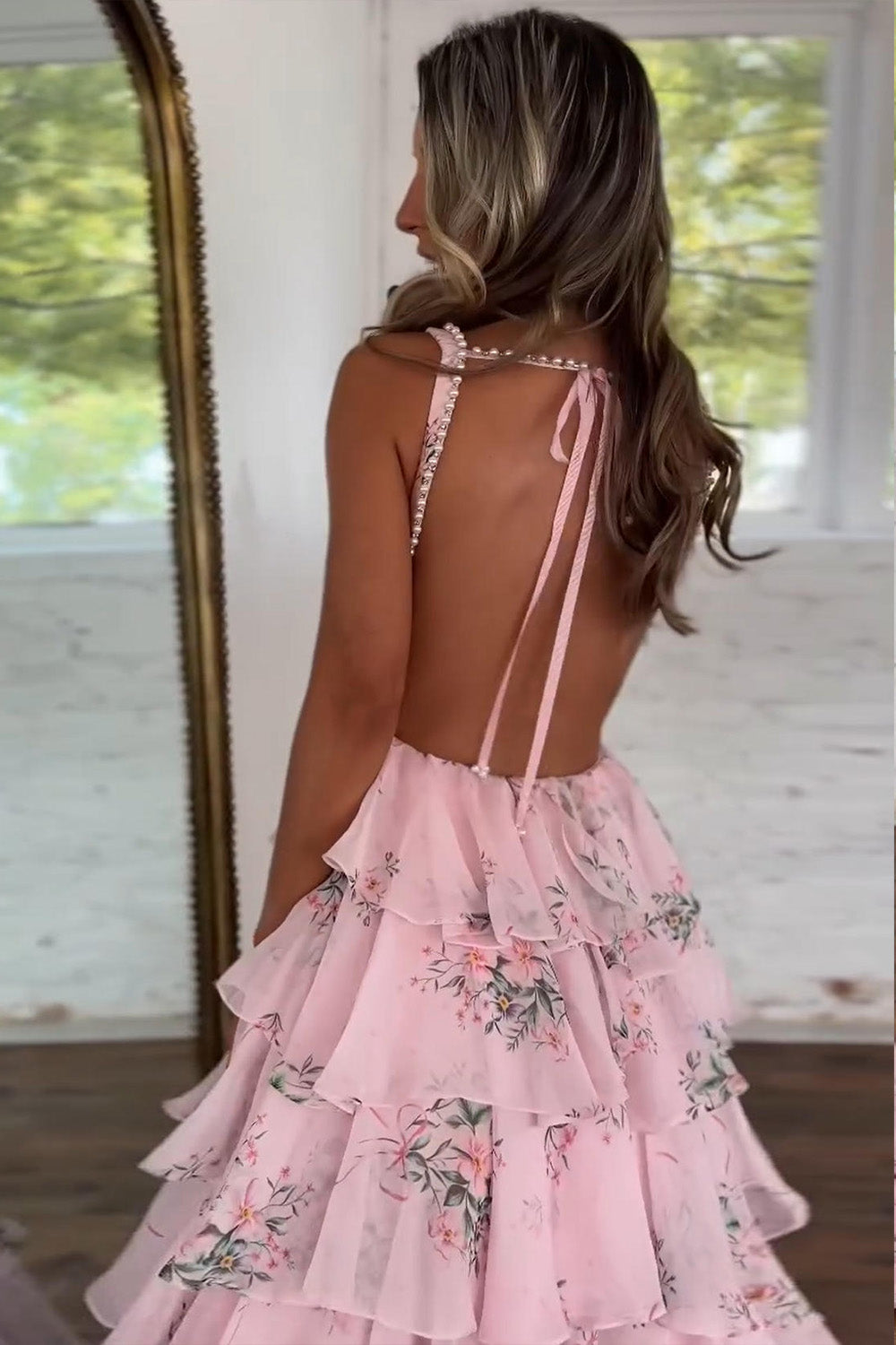 Fall in love with the romantic charm of this pink floral prom dress. Designed with a square neckline, it offers a modern yet elegant frame for the décolletage, while the backless design adds a bold, alluring touch. The tiered ruffle skirt creates soft volume and graceful movement, complemented by a stylish slit for added allure. Perfect for prom night or formal occasions, this gown blends feminine romance with contemporary flair.