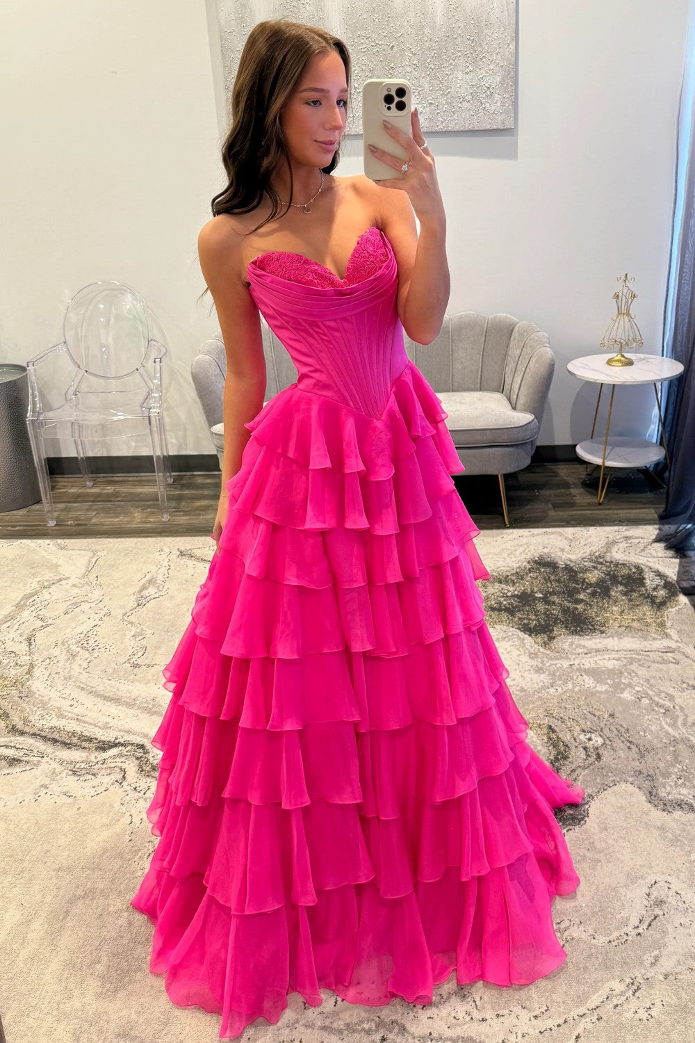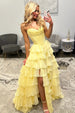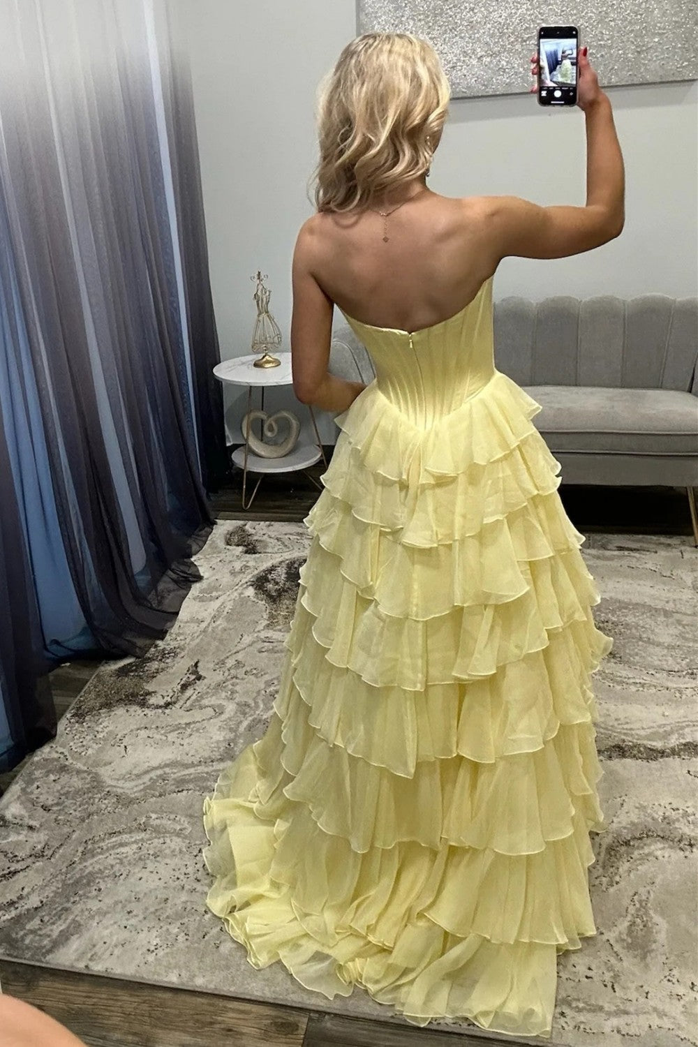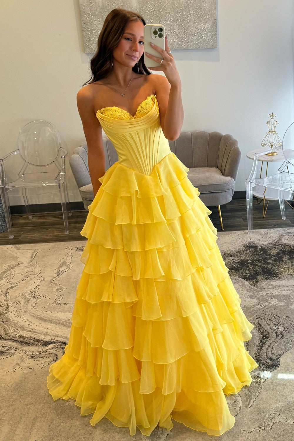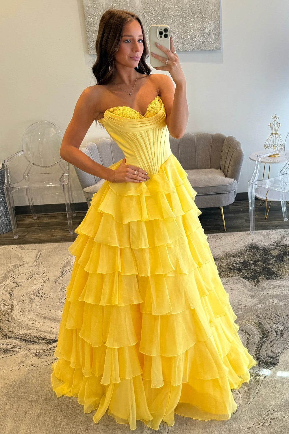 Step into a fairytale moment with this romantic yellow ball gown prom dress. Featuring a sweetheart neckline and a structured corset bodice, it beautifully shapes and supports your silhouette. The airy chiffon skirt flows into tiered ruffles, creating dreamy volume and graceful movement with every step. Radiant and feminine, this gown is perfect for prom, formal events, or any special occasion where you want to shine with elegance and charm.