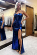 Shine in this royal blue metallic strapless prom dress. The lace-up back ensures a customizable, flattering fit, while the ruched waist accentuates your curves. A high slit adds bold sophistication and movement, making this gown perfect for prom, galas, or any formal occasion where you want to make a statement.