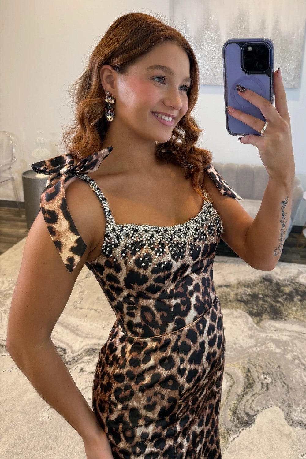 Make a fierce and unforgettable statement in this sexy leopard print prom dress. Designed with delicate spaghetti straps and a figure-flattering silhouette, it highlights your curves while maintaining elegant balance. Intricate beading adds dazzling sparkle, elevating the bold leopard print with a touch of glamour. A daring front slit enhances movement and allure, making this gown perfect for prom, formal evenings, or any special occasion where you want to stand out with confidence.
